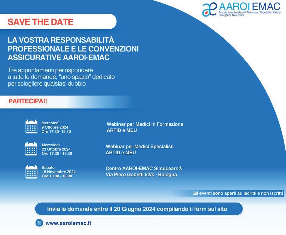 A questi temi si aggiunge la questione sempre di grande interesse della responsabilità professionale anche nei suoi aspetti medico-legali e assicurativi su cui l’AAROI-EMAC lavora da oltre un decennio per offrire alle Colleghe e ai Colleghi il massimo della serenità possibile durante l’attività professionale.
