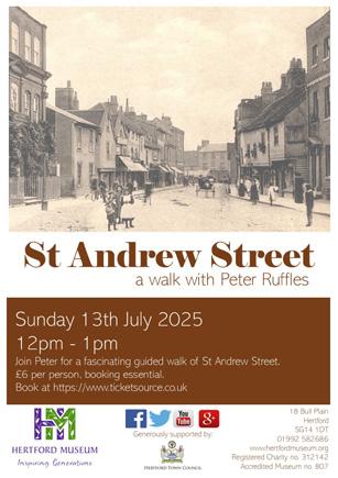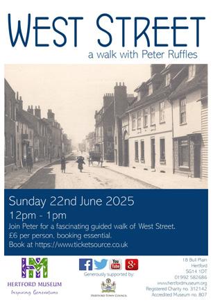 Hertford Museum in Bull Plain is a cherished community resource keeping the town’s history alive for both local residents and visitors. Alongside the permanent displays and regular exhibitions, the museum organises a vibrant programme of events for all ages including talks and guided walks. For more information, details of future events, and to book visit hertfordmuseum.org/events.