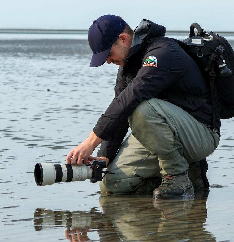 For those times you want that dramatic, eye-level or below eye-level look without lying in the mud, use my “flip low” shooting technique. Rotate your lens collar so the foot is on top, hold it with your left hand, flip out your LCD, and drop the camera all the way to the ground. This is how I captured this super low-angle image of the King Eider without lying in the mud and getting wet. The photo on the left shows the technique in action, notice my right arm is braced against my right knee for stabilization.