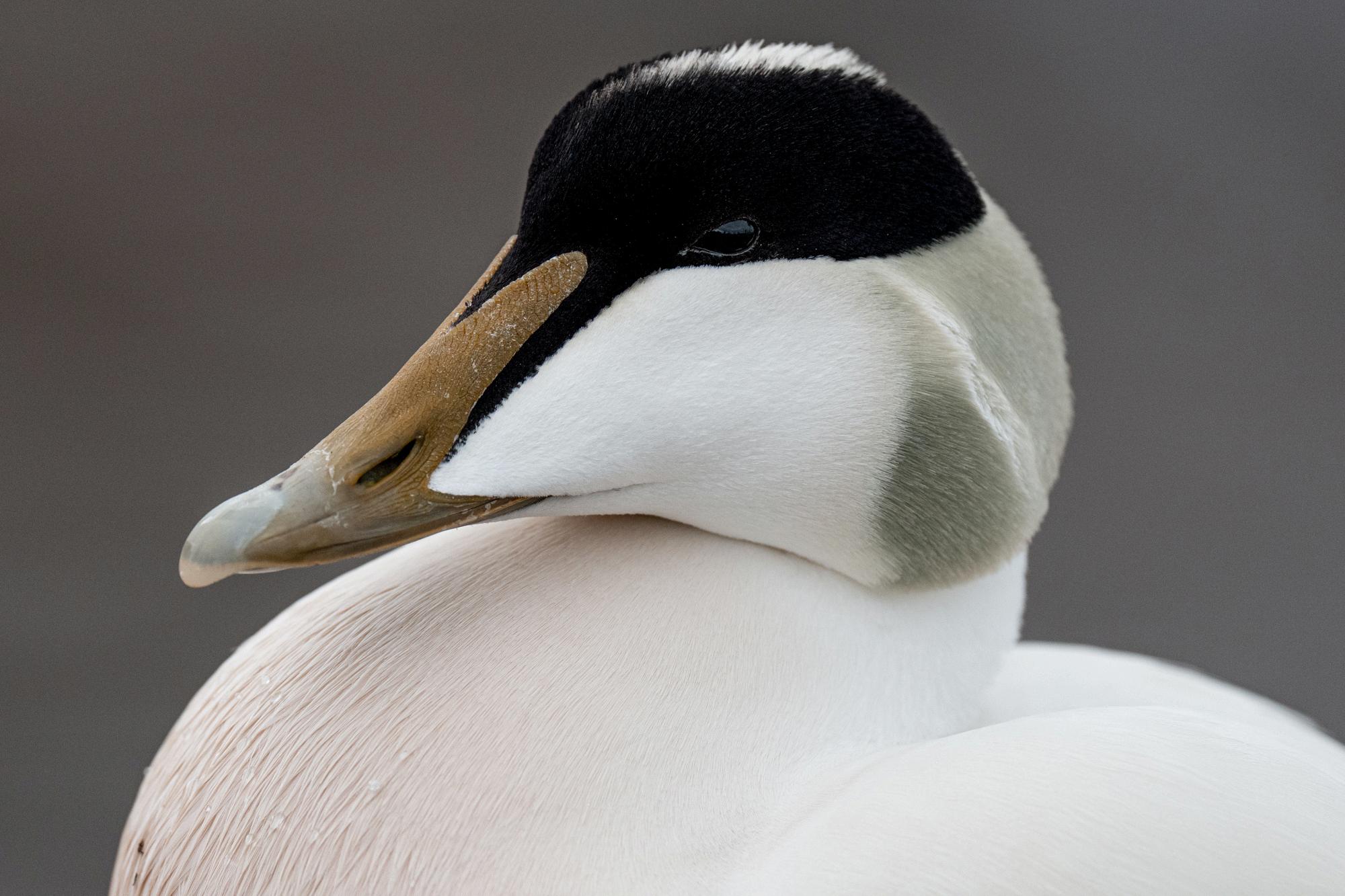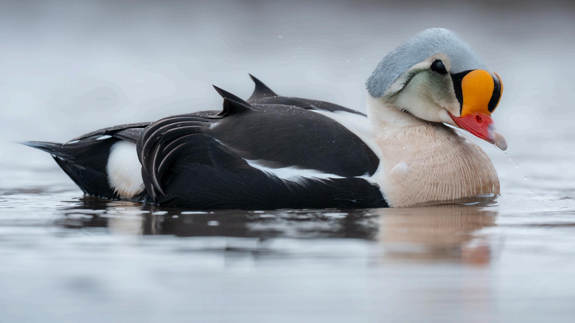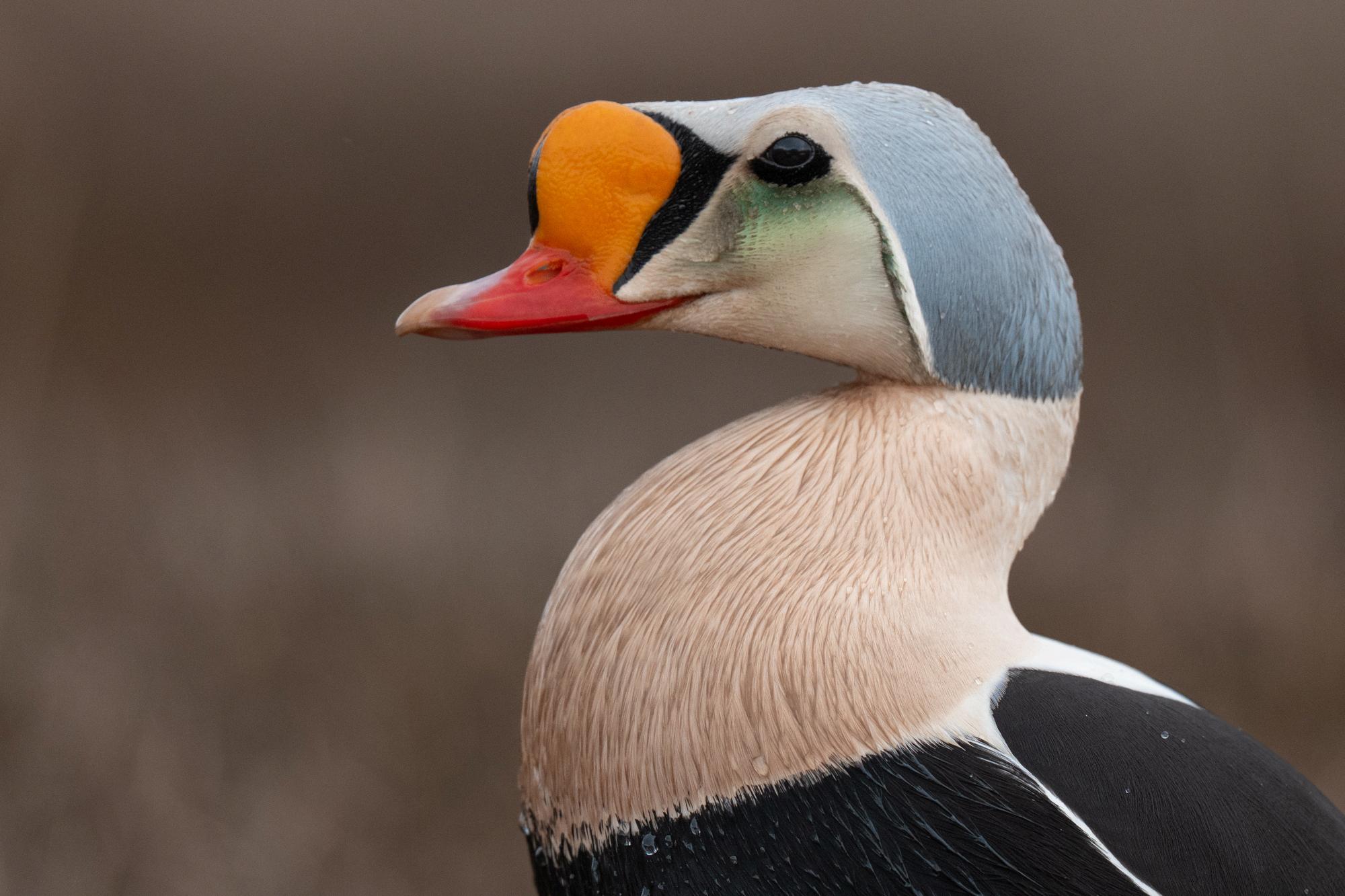 A few years back, I learned about a nesting colony of eiders on the island but never had the chance to visit. This year, I arrived a day ahead of the group to scout and prepare for the adventure ahead. At the nesting site, just as promised, dozens of female eiders sat on eggs, so close you could almost step on them if you weren’t careful. Males patrolled the colony or floated lazily on one of two ponds. After making a few headshots and scouting farther into the hills, several hours of searching finally paid off, we found a male King Eider courting a female on a quiet pond. Using our fieldcraft, we approached slowly and steadily until I was filling the frame with headshots. We carried a rifle for safety, polar bears occasionally wander into the area, and the rule here is you never venture outside of town without one. The key was moving low and slow, avoiding too much direct eye contact with the birds. Even though the light was flat, this “well-dressed” individual was worth a portrait. With headshots, it’s usually all about expression, but these birds didn’t give me much of that, so I focused on highlighting the rich color palettes and intricate feather details that make these impressive birds so striking.
