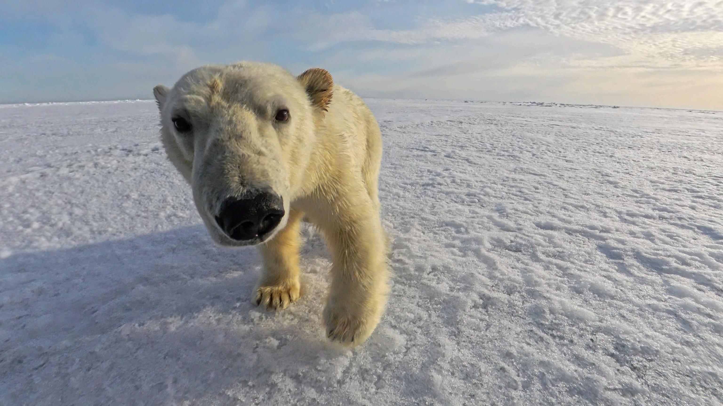 At midnight, just an hour after my head hit the pillow, there was a knock on my door: “Polar bear!” One of the night-shift crew had spotted a cream-colored bear on the distant horizon. It was over a mile away, so we had time to get everyone geared up again, though we were all running on fumes.