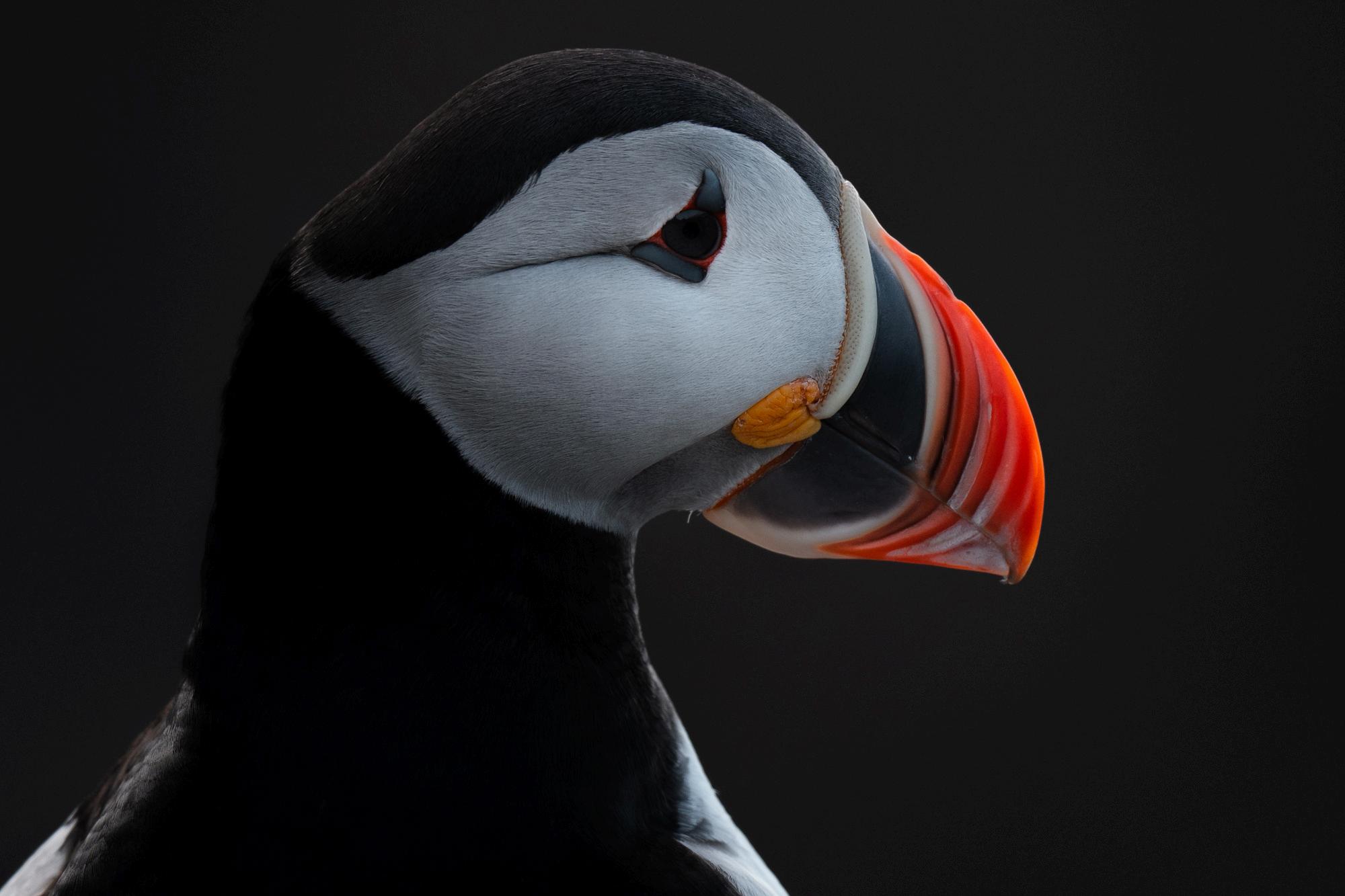 Along the way, we visited several puffin nesting colonies. For this headshot, my subject wasn’t offering much in the way of expression, no wing stretch, no beak full of fish, so I worked with what I had. A gentle kiss of backlight brought the bright orange beak to life against the darker tones, creating a simple but nice portrait.