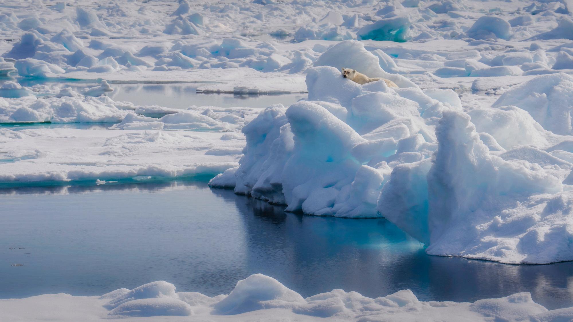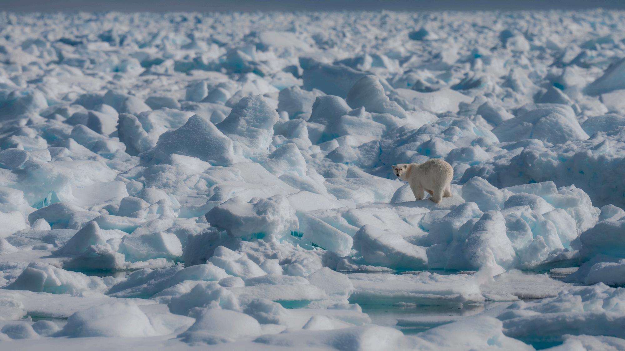 The Shot: A lone polar bear sitting on fractured glacier ice, shot wide to show the immensity of the Arctic landscape.