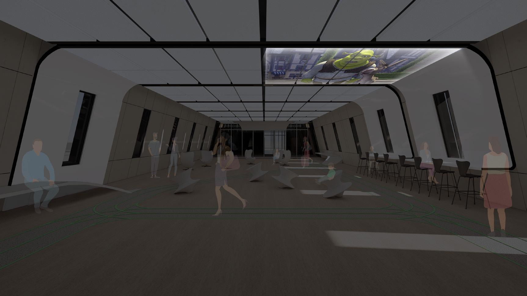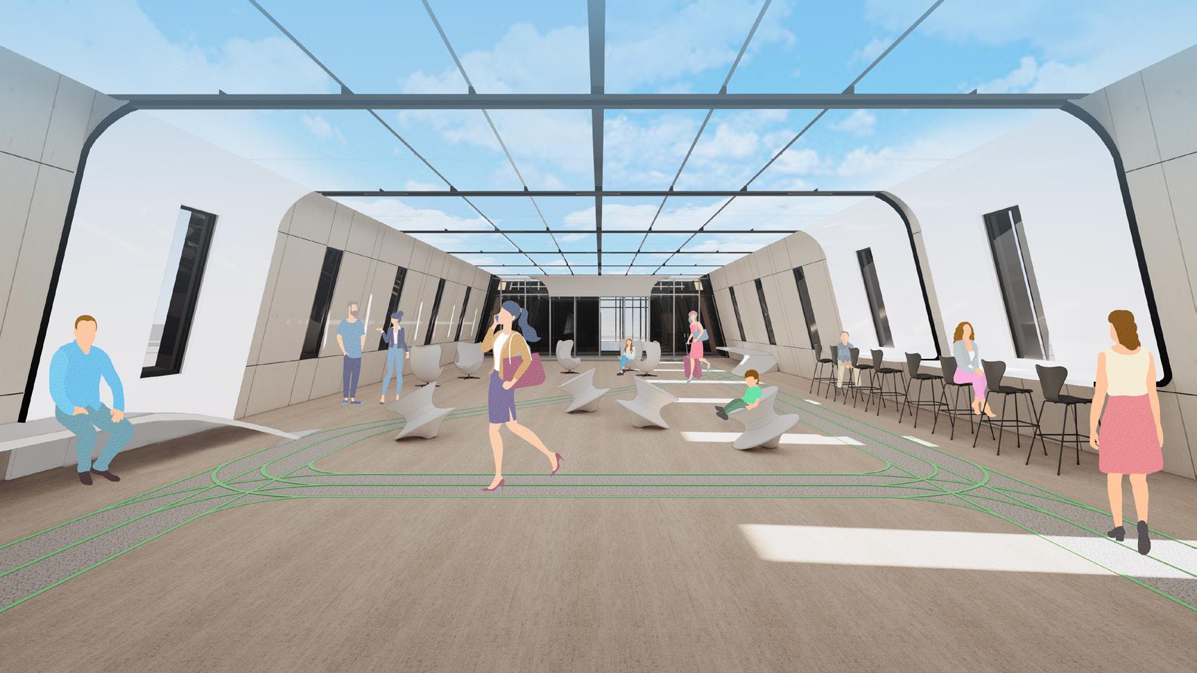 We redesigned the streets on the site to be better for pedestrians and public transit. Our building spans over 3rd street, using it as a tool to focus attention on the train. We designed it to focus your view...