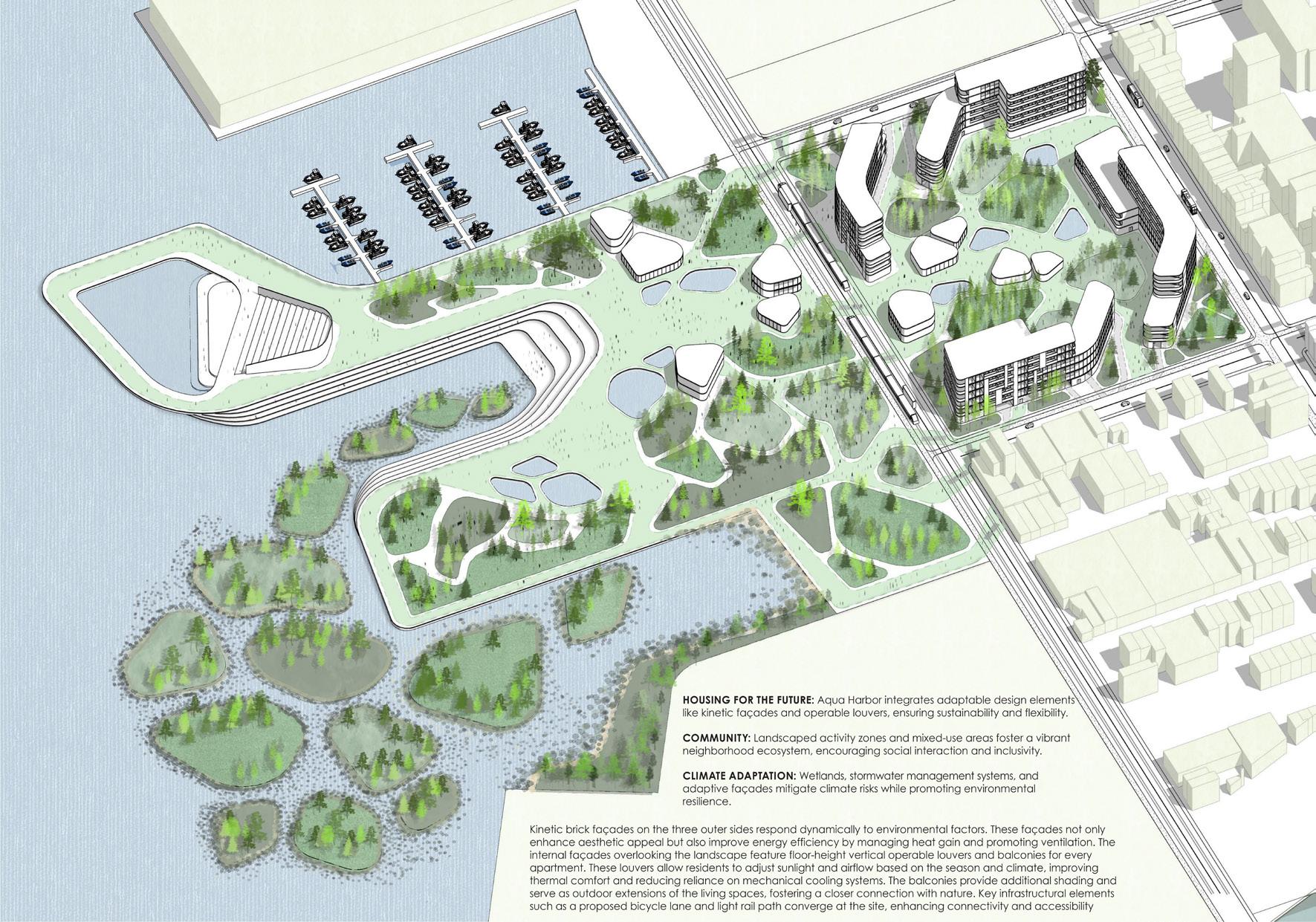 Each cluster of buildings frames the streets on three sides, while the fourth side opens to landscaped zones and the harbor—blurring the boundary between built and natural environments. The landscape belt, featuring an auditorium, swimming pool, and recreational spaces, gradually transitions into wetlands that serve as both an ecological buffer and a zone for water-based activities like kayaking, reflection, and restoration.