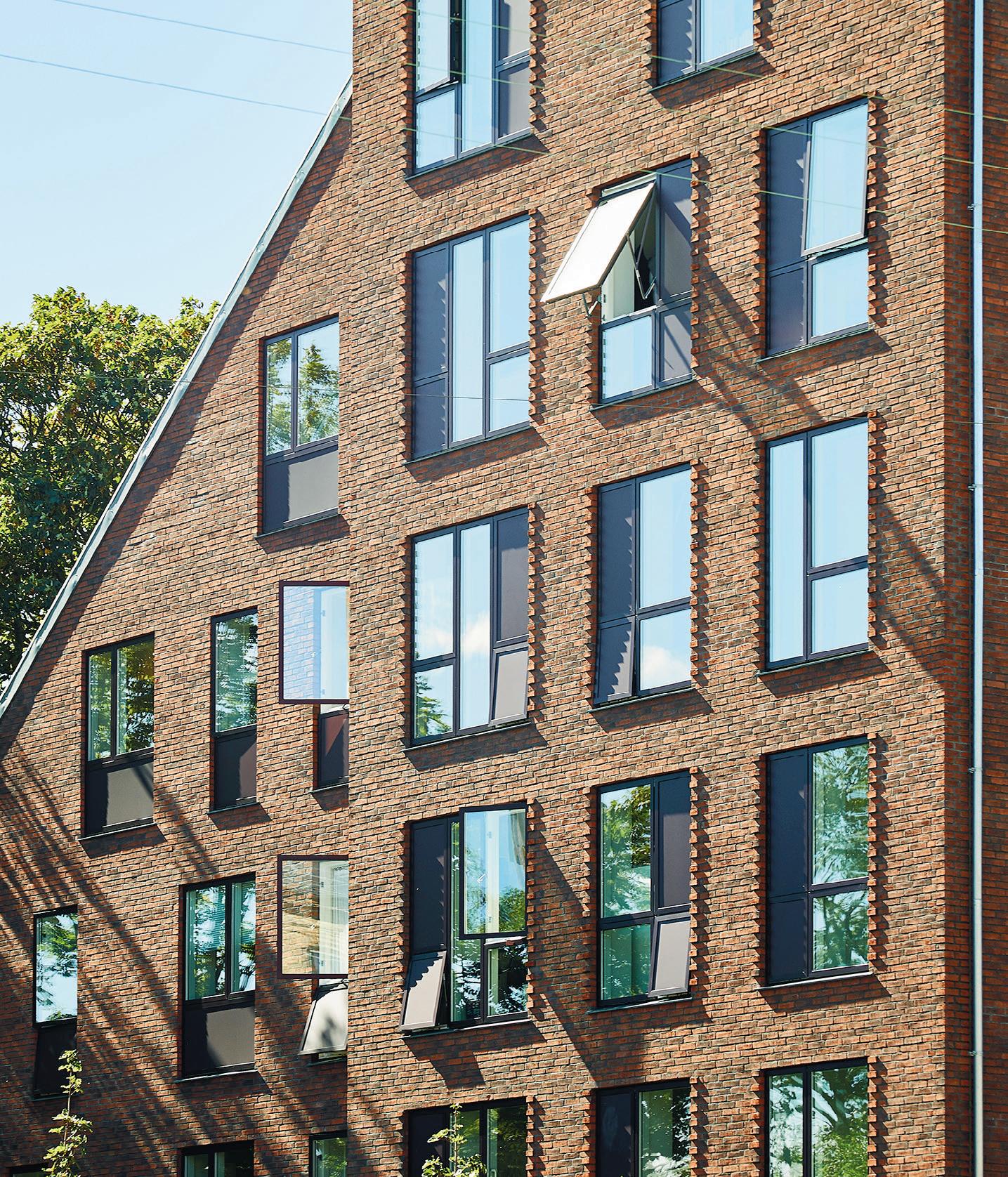 For Mangor & Nagel er et vindue aldrig blot et vindue. Det er en unik mulighed for at skabe variation i facaden, da det kan rykkes frem eller trækkes en anelse tilbage for at opnå en subtil reliefvirkning. Det samme gør sig gældende for murværket, hvis udtryk er grundigt gennemarbejdet for at skabe spil, afveksling og reference til det nærliggende Frederiksborg Slot.