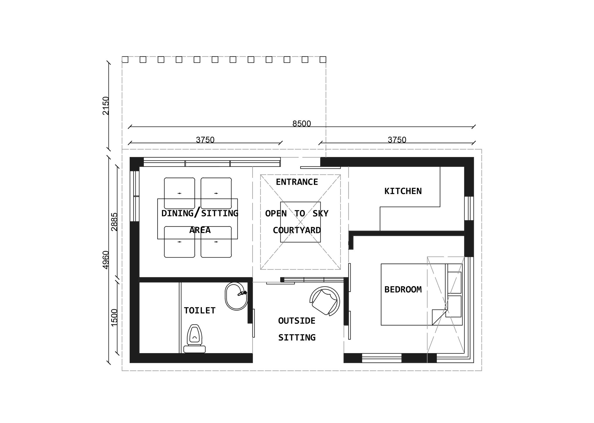 The ideology behind the design of this microhouse was to recreate the courtyard system that was practiced in traditional Indian archi tecture and include it in the structure creating a buffer space.