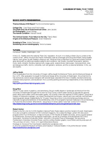 TUTORS____________________________________________________________________________________________ Hometown: Seattle, Washington. USA In the U.S., Seattle owns the national “Rain City” reputation. As such, it is clearly a Sister City to London in the context of rain. Jeffrey moved to the Pacific Northwest coast as a teenager and Doug and Robert, being Seattle natives, have grown up with Seattle’s infamous rain. What we know is that there is a good and a bad to all that goes along with our particular weather patterns and conditions: rain forests, mountain snow packs, glaciers, rivers, lakes, streams, flooding, leaking roofs, soggy yards, soaked shoes, tidal surges, rising sea levels, slow and dangerous traffic, storms, umbrellas, lush rain gardens, rainbows, and the occasional landslide. In this, we are experts. Jeffrey Smith Prior to graduation from the University of Oregon Jeffrey taught Architectural Theory and Architectural Design at the U of O. After graduation he taught Architectural Design at the University of Washington. Since that time he has worked as a senior project designer with several large corporate firms here in Seattle, traveled extensively, collected slide projectors, and studied art. He is currently painting and working independently on two residential projects. http://jeffreysmithworldphotography.com/ Doug Rice After a 15 year career in graphics, and advertising, Doug’s midlife degree in landscape architecture from the University of Washington brought him to work for King County’s Storm water Section to educate the general public about storm water control and water quality. He currently chairs the regional STORM coalition. Doug has a mastery of interpretive signage, Low Impact Development techniques, natural yard care methods, and has been teaching garden design independently for 18 years. Doug has a minor in environmental psychology and is a nationally recognized practitioner of Social Marketing. One of his programs has been featured in Social Marketing to Protect the Environment: What Works. Doug has a TV show called “Yard Talk” on the KCTV Network: http://www.kingcounty.gov/environment/stewardship/nw-yard-and-garden/yard-talk.aspx Robert Horton Robert is the film critic for KUOW (Seattle's National Public Radio station) and the Herald in Everett, Washington; he is also a longtime contributor to Film Comment magazine. He curates the Magic Lantern film-discussion program at the Frye Art Museum, is Adjunct Faculty in Film Studies at Seattle University, and is a guest speaker for Smithsonian Journeys and Humanities Washington, as well as a member of the Broadcast Film Critics Association. His books include Billy Wilder: Interviews (University Press of Mississippi), the upcoming Frankenstein (Columbia University Press), and the zombie-Western graphic novel Rotten and its prose spin-off The Lost Diary of John J. Flynn, U.S. Agent (Moonstone Books). He blogs on movies at The Crop Duster (roberthorton.wordpress.com). In 2012 he curated the Museum of History and Industry's "Celluloid Seattle: A City at the Movies" exhibit. http://roberthorton.wordpress.com/