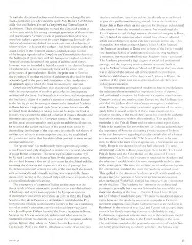 In 1<)66 the d irection of architectural discourse was changed by (wo books published just a few months apart: Aldo Ross i's L'ar(hilfllllfr/ dt>f/(/ (ilia and Roben \'~IHLlri 's (,ollJp/fxity alld COII'raoirtioll in A.rrliilfll/1rr. Their simultaneitv marked the climax of a crisis in Mchitccture widely felt among a younger generation of theoreticians and practitioners. \ 'cn wri' s book in particular claimed to be a ITIanifc.;sto (a lbeir a gentle one) for a new beginning. l ronicall~:', thi, rhetoric of renewal was linked (0 a re-examination of architecwr:tl history which - at least on tht:: surface - had been sup pressed by the ;lv<!IH-gardes of the tWL:ntieth cCIHury. Indeed, a largc number of the images reprodu ced in Complexity alld r:ontrodirlioll referenccd the buildings of nunncrisnl and late baroque in England anJ Ital y.' \ 'cIHuri's reconsideration o f the canon of architccrural history. however, was nO( inrcnded to herald a rerum ro the classical language of architecture, as was erroneousl\'. belic\ed h\'. .some larer protagon ists of postmodcrnism. Rather, the point was to illu~rr;.m; the cxistcnce of another tradition of architecture that had nor been acknowledged by the purity and ahistoricism of latc modernism an approach against which t he book was ostcnsibly directed. ("ompiexi/.y and CO/lln/diction rh LIS ma n ifested \ 'cnruri 's u neasc \\'ith the interpretation of modern princ iplc:s in conremporary arehinxwral discourse. But bcneath its iconoclasm, it also represented the inrdlcetual digcst of its author's extensive travels across Europe in the late [9405 and his two-year tenure at the American Academy in Romc between [954 and 1956. Since Vtnwri characte ristically refra ined from sketching or taking nmes o n his uips, the book is in man y ways a somewhat dehlycd collection of imagcs, thoughts and itineraries generated by his European sojourn. By marrying architectural connoisseurship once again to architectural tourism, he resumed the earl it::( tradition of the g rand tour. while by channelling the findings of the trip into a historically rich theory of architt:ct ure relevant to contemporary practice, he established the pJrildoxical nexus that has defineJ his position in more recent architectural history. The 'grand tOur' had traditionally been Cl perennial journey ;lCross France and rtaly des igned ro iniriaw the class ical education of young British aristOcrars.l ' I'he term itself wa~ fi rst lIsed in 1670 by Richard L assels in his l'oyngfoJI/a/y. By the cightcenrh century, the tour had bccome a firm social convcnrion for [he British nobility:, <bs Lllning the character and importance of a rite of rass,-Igc, but by the latc ni ncrccmh century the idea of rhe tour itsc..:!f also toured, with econom ically and cul{Urally aspiring Am L: ri o lll middle classes increasingly see ing in the c itie s of Italy and (;recce a repository for :1 highcr form of cultUral learning. The emergence of a canon of Italian arehircewrc was rhe direct rcsu lt of {hcse ari s(()crat ic gra nd tours; an t:st<lb lished body of blli ld ings and styles soo n supported by European systems of arch it cc rural ~md artistic education. As early as 1663. the French Ac'ldcmie Royale de Pcimure et de Scu lpture established thc Prix dc Rome anJ officially sanctioned the journey to Italy as a m<lndatory parr of an artist's education, J move endorsed three years later when Jean-Baptiste Col ben fOLJnded the Frt;;nch Academy in RaTTle. As far as the LIS was concerned, arch itectura l educat ion in th e nin ctccmh century was heavi ly re liant upon the European academy SY:HC Ill. Before 1865, when the \Ia <;<;ac huscrci In!>titutc of T echnology ( ~IIT) was first to introduct.: ~I COl lr<;e of architecrure