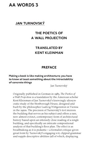 PREFACE Making a book is like making architecture; you have to know at least something about the intractability of concrete things Jan Turnovský Originally published in German in 1985, The Poetics of a Wall Projection is a translation by the American scholar Kent Kleinman of Jan Turnovský’s knowingly idiosyncratic study of the Stonborough House, designed and built by the philosopher Ludwig Wittgenstein in Vienna in the 1920s. The precision of Turnovský’s text mirrors the building that serves as his subject and offers a rare, now almost extinct, contemporary form of architectural history based upon an intensely close reading of a single building, and specifically an intricate compositional analysis of that building’s floor plan. The effect is as breathtaking as it is pedantic – a formalist critique given great form by Turnovský’s engaging wit, clipped grammar and supple descriptive abilities (all of which, displaying