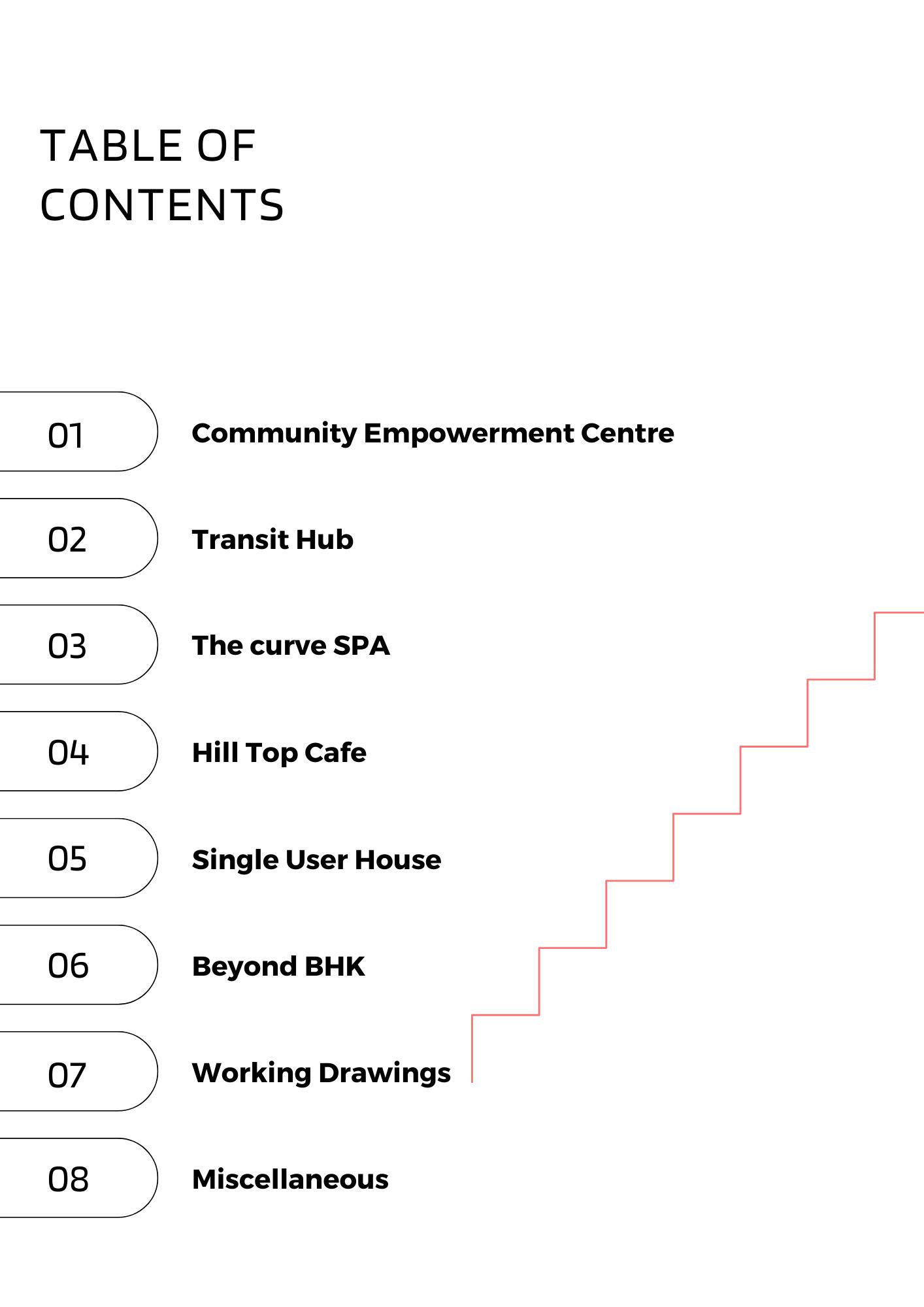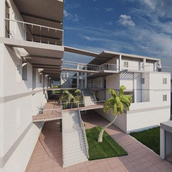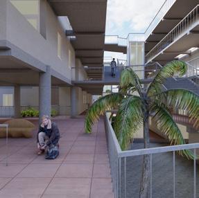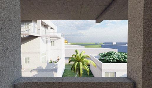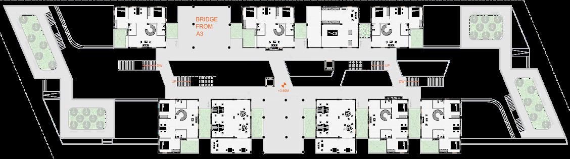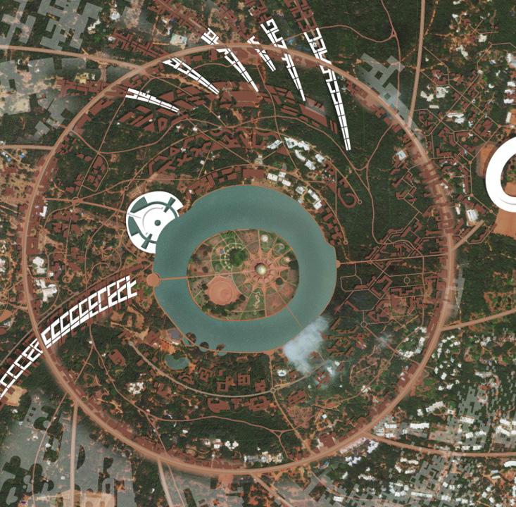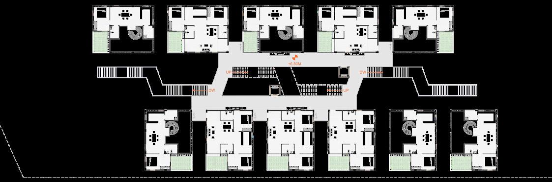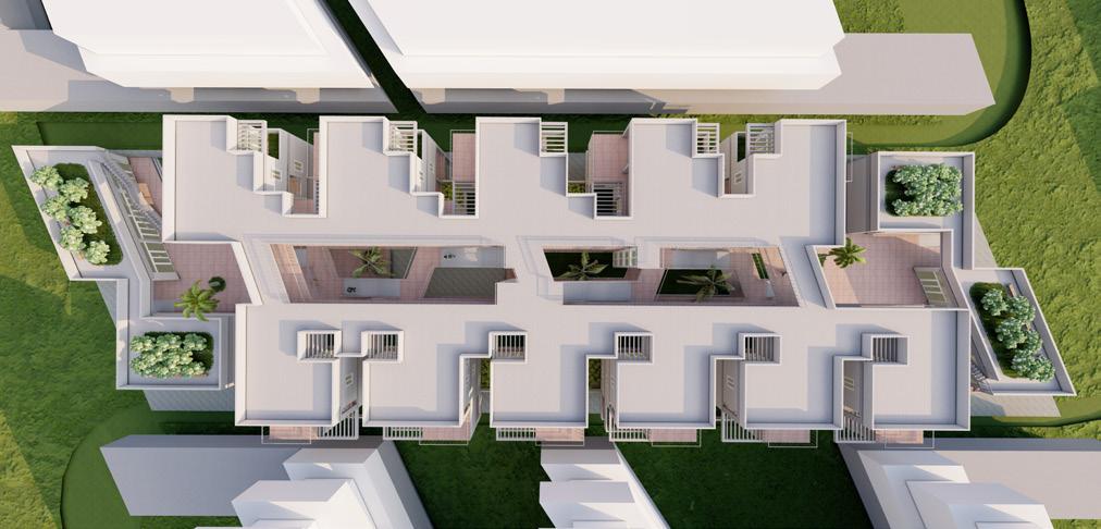 Each unit has their own court yard / green brakeout space and the common circulation spaces such as coridors, zig-zac staircase and visitors tracks at ground level are connect to the green pockets and trasparent to the surroundings and edge of every common spce at different level has a better view towards matrimandir.