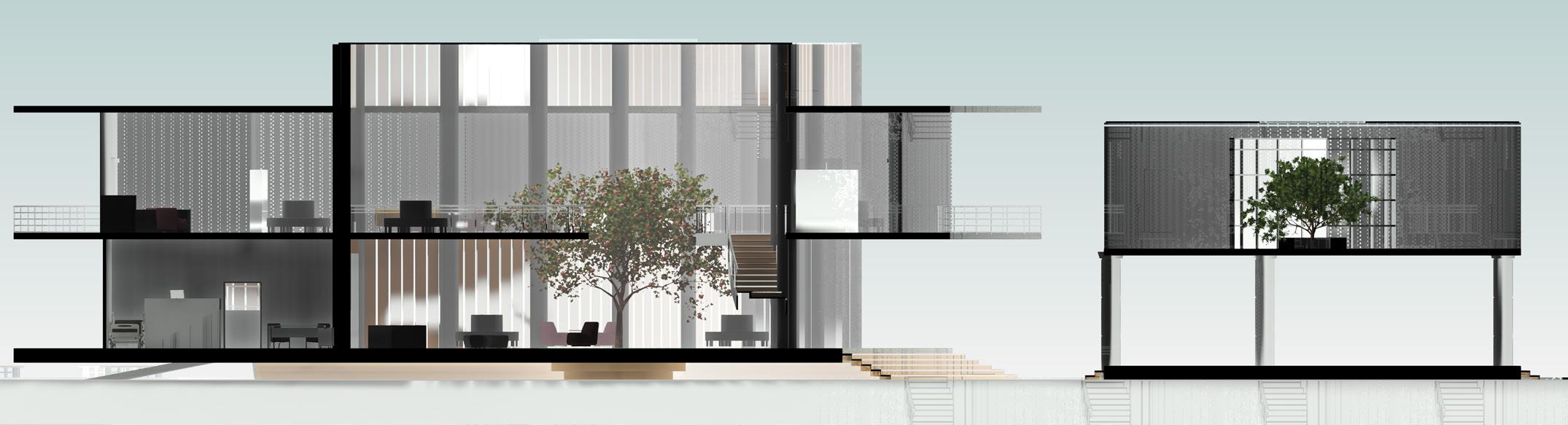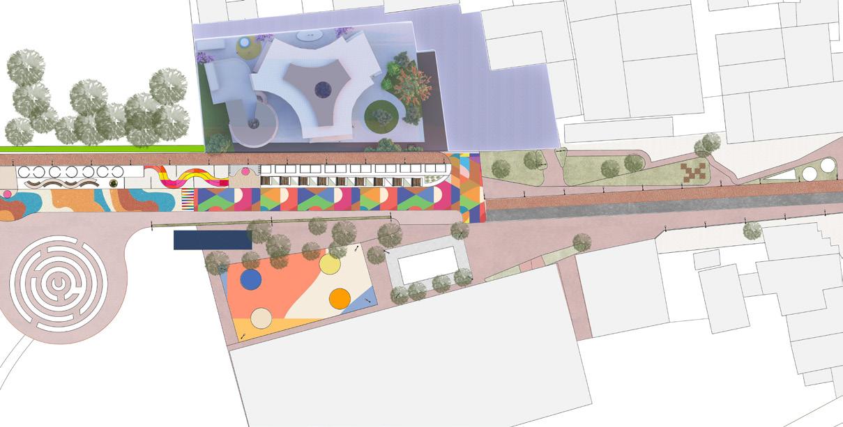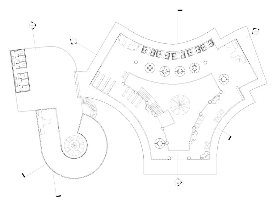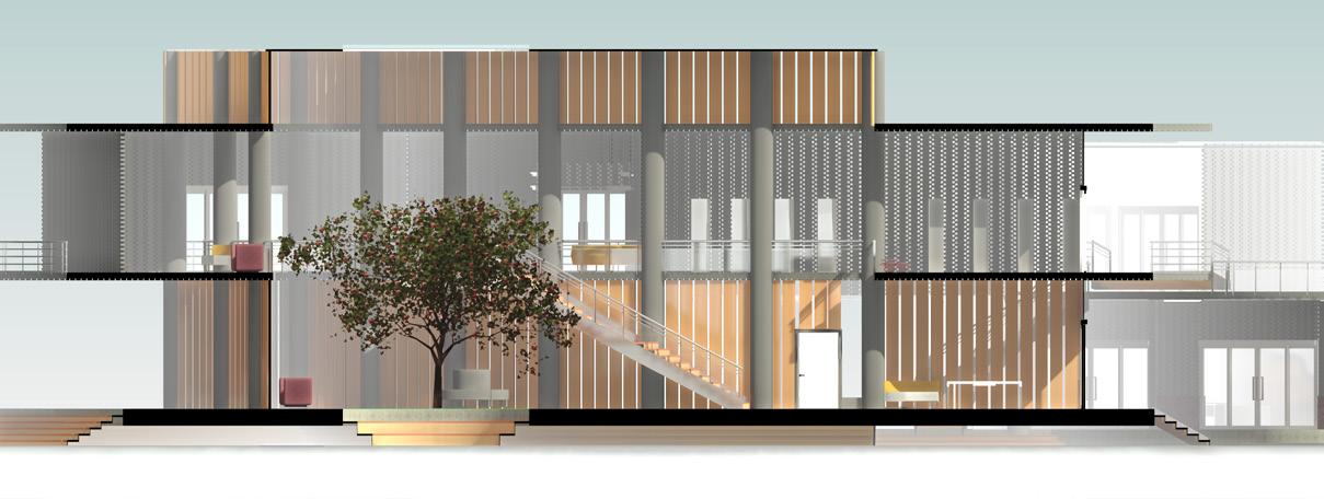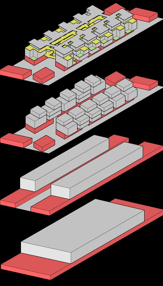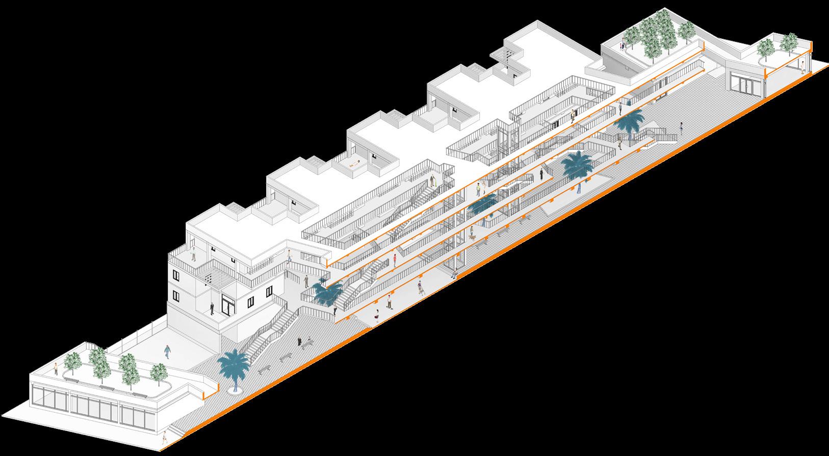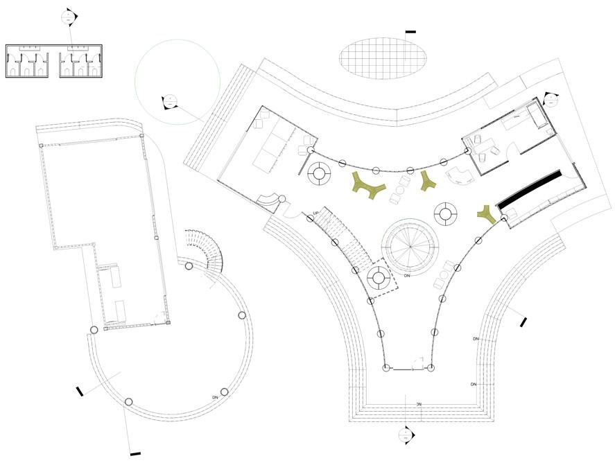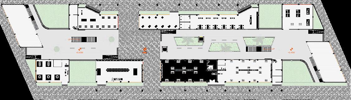 Three different zones are separated and connected through triangulation that respondns to their corresponding surroundings and interacts with it. Multiple informal spaces and green are flexible in their own ways and adaptable to the users, play of heights / levels and connections of different levels defines the hierarchy of individual spaces.