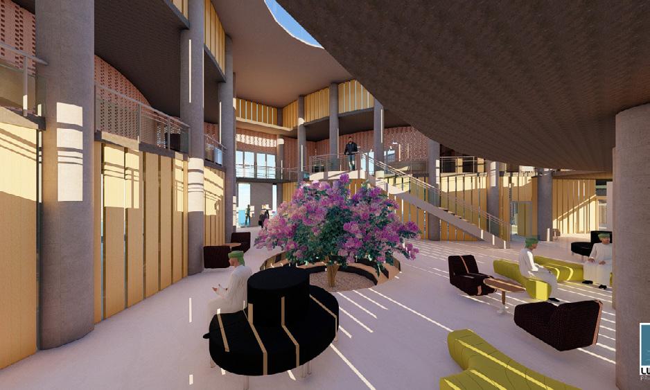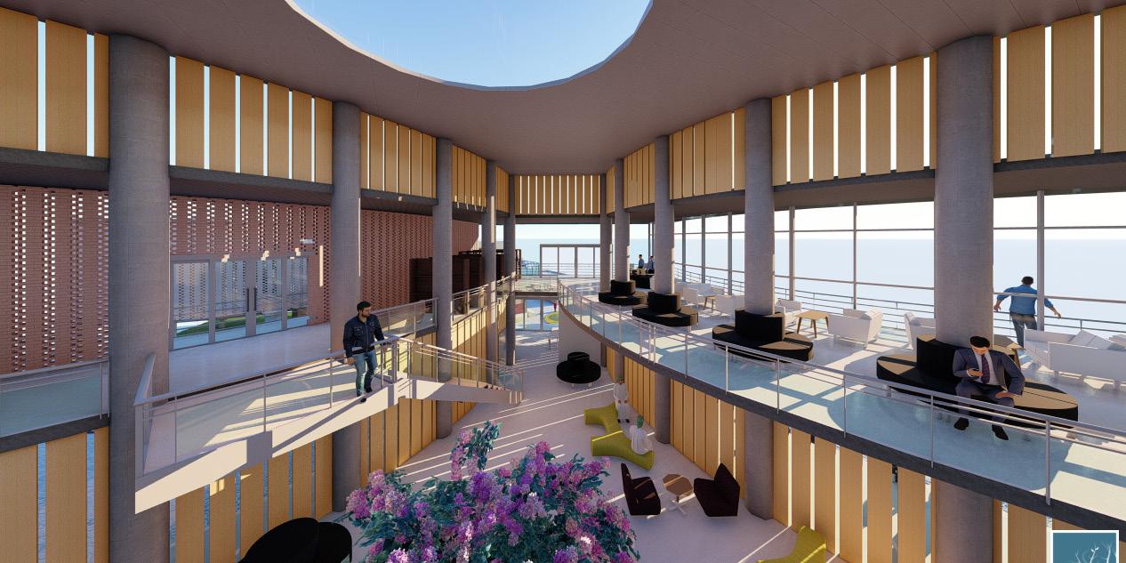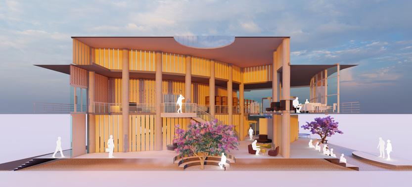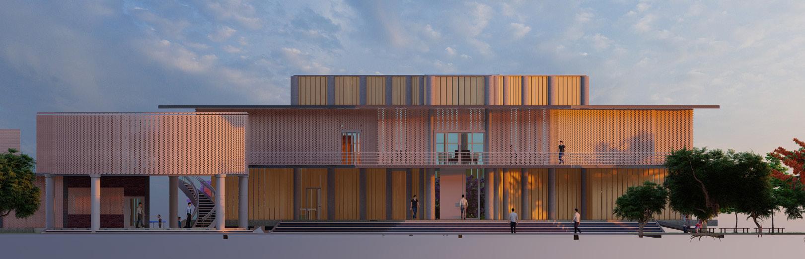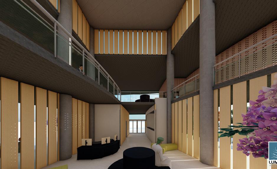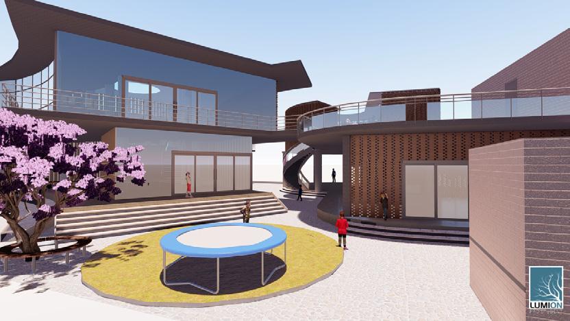 A large central atrium with a central courtyard and play of shadows that created by the voids of walls and skylight that connects clinic, skill and knowledge centre, And anganwadi which acts as a common lobby and intraction zone. It creats openess and flexibility of spaces that makes the users socialize and interact. Two elements glass and jali walls that creats transparency as well as makes the space private.