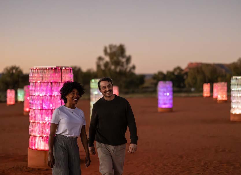 Start your day with the breathtaking Sunrise Field of Light experience by Artist Bruce Munro. Immerse yourself in the mesmerizing art installation and enjoy the desert awakening as the sun rises over Ulu r u. After sunrise return to the hotel for breakfast. Then, venture to Kata Tju t a for a morning of exploration and awe-inspiring landscapes as you wander through Walpa Gorge Enjoy some free time for lunch, before embarking on a tour at the base of Ulu r u, delving into the rich cultural significance of this sacred site. Cap off your day with sunset drinks, soaking in the vibrant colors of the Outback and the changing colors of Ulu r u as the sun sets. The evening is yours to unwind and enjoy at leisure.