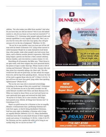 abilities. “For who makes you differ from another? And what do you have that you did not receive? Now if you did indeed receive it, why do you boast as if you had not received it?” (1 Corinthians 1:7). Criticizing other people’s physical looks and mental capabilities’ is very ungodly. Jesus said, “But I say to you that for every idle word men may speak, they will give account of it in the day of judgment” (Matthew 12:36). “Do not lie to one another, since you have put off the old man with his deeds (Colossians 3:9). Lying comes natural to sinful humanity! People lie to make themselves look better than other people, make other people’s sins look worse than theirs, and to destroy another person’s reputation. With their lying tongue a person can become a thief, commit adultery, destroy families, and even destroy a nation (James 3:1-12). Describing all of humanity, the Bible says, “Their throat is an open tomb; with their tongues they have practiced deceit; the poison of asps is under their lips. Whose mouth is full of cursing and bitterness” (Romans 3:13-14a). Anyone who says they never lie is instantly telling a lie. Peter said, “He who would love life and see good days, let him refrain his tongue from evil, and his lips from speaking deceit…because the face of the Lord is against those who do evil” (1 Peter 3:10-12). “A liar will love evil more than good, lying rather than speaking righteousness” (Psalm 52:3). “Put on the new man who is renewed in knowledge according to the image of Him who created him” (Colossians 3:10). As Christians we are to [by faith] consider our old sinful lifestyle crucified with Christ and dead (Romans 6:6). When we trusted in Jesus Christ as our Lord and Savior we were spiritually born again and received the Holy Spirit. “If anyone is in Christ, he is a new creation; old things have passed away; behold, all things have become new” (2 Corinthians 5:17). There’s no good excuse for a Christian to live an ungodly lifestyle; it demonstrates that a professing Christian isn’t truly born again, or they’re being disobedient Christians. God has every right to discipline a Christian who’s living an ungodly lifestyle (Hebrews 12:3-11). Many disobedient Christians have died an early death because of their ungodly words and actions (1 Corinthians 11:30-32, 1 John 5:16-17). No Christian can live a perfect life while we’re living in our earthly body, but we can do our best!