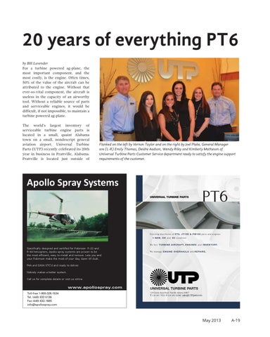 20 years of everything PT6 by Bill Lavender For a turbine powered ag-plane, the most important component, and the most costly, is the engine. Often times, 50% of the value of the aircraft can be attributed to the engine. Without that ever-so-vital component, the aircraft is useless in the capacity of an airworthy tool. Without a reliable source of parts and serviceable engines, it would be difficult, if not impossible, to maintain a turbine powered ag-plane. The world’s largest inventory of serviceable turbine engine parts is located in a small, quaint Alabama town on a small, nondescript general aviation airport. Universal Turbine Parts (UTP) recently celebrated its 20th year in business in Prattville, Alabama. Prattville is located just outside of