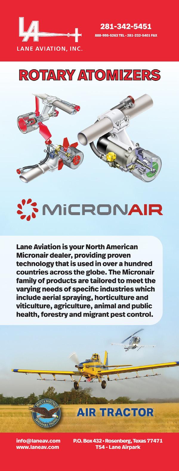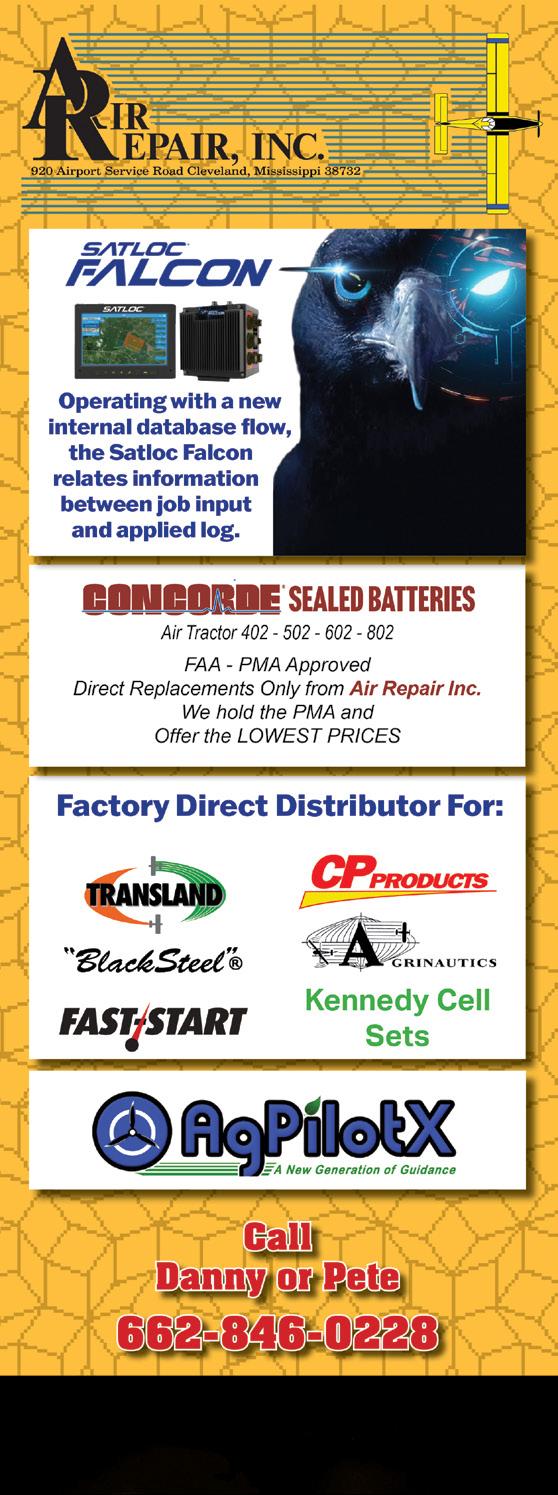 Wanted – We are looking for a fixedwing pilot and/or helicopter pilot. We are located in Northern California. Most of our fixed-wing work is seeding, fertilizing, and dry and wet herbicides on rice. Dry work experience is preferred. Our helicopter work is mostly orchards. We operate AT-602's, Ag Cats and UH-1H. We offer excellent benefits for full-time employees. This could be a seasonal position as well. We can help with travel expenses, lodging, and or relocating. Email Alex at alex@avag1.com
