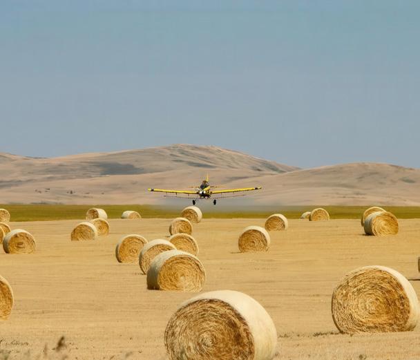 An Air Tractor soars over golden hay bales in Alberta, Canada.