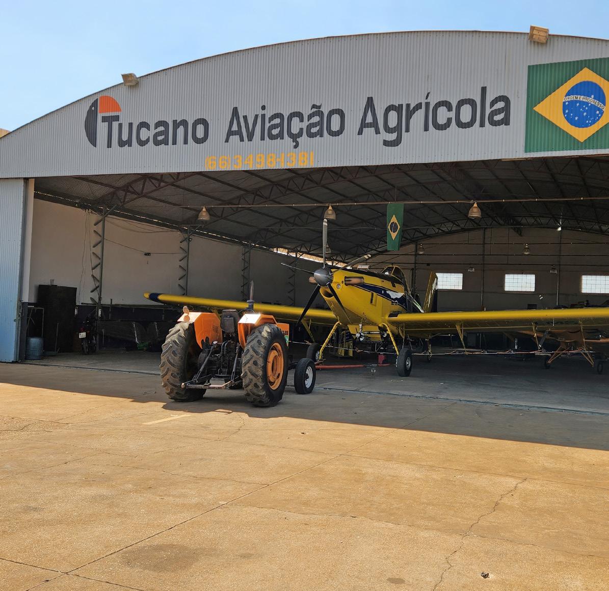 O hangar da Tucano Aviação Agrícola no Aeroporto de Primavera do Leste parece grande para uma empresa com três aviões, mas ele também serve como oficina de instalação e manutenção para GPS da Ag-Nav pela DGPS & Cia. O avião na porta do hangar é um Air Tractor AT-802 de um cliente da DGPS & Cia.