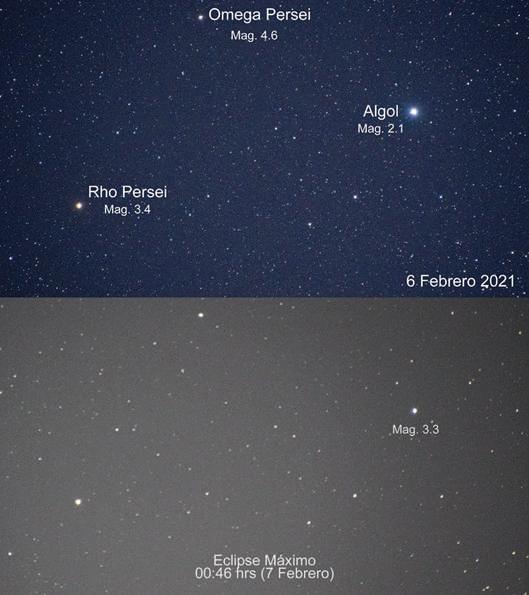 Observa en estas fotos, arriba, el inicio del eclipse; abajo, el momento de máximo ocultamiento. Fíjate en la diferencia de brillo de Algol y Rho Persei al inicio y máximo del eclipse.