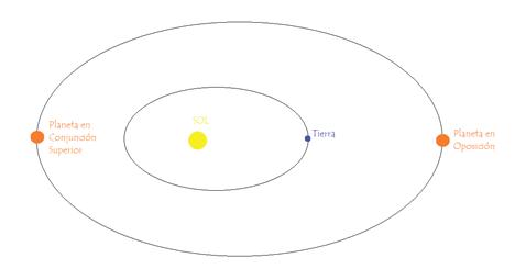 La conjunción superior es la fecha en que ese planeta se halla detrás del Sol con respecto a la Tierra. Esto se muestra en el siguiente diagrama