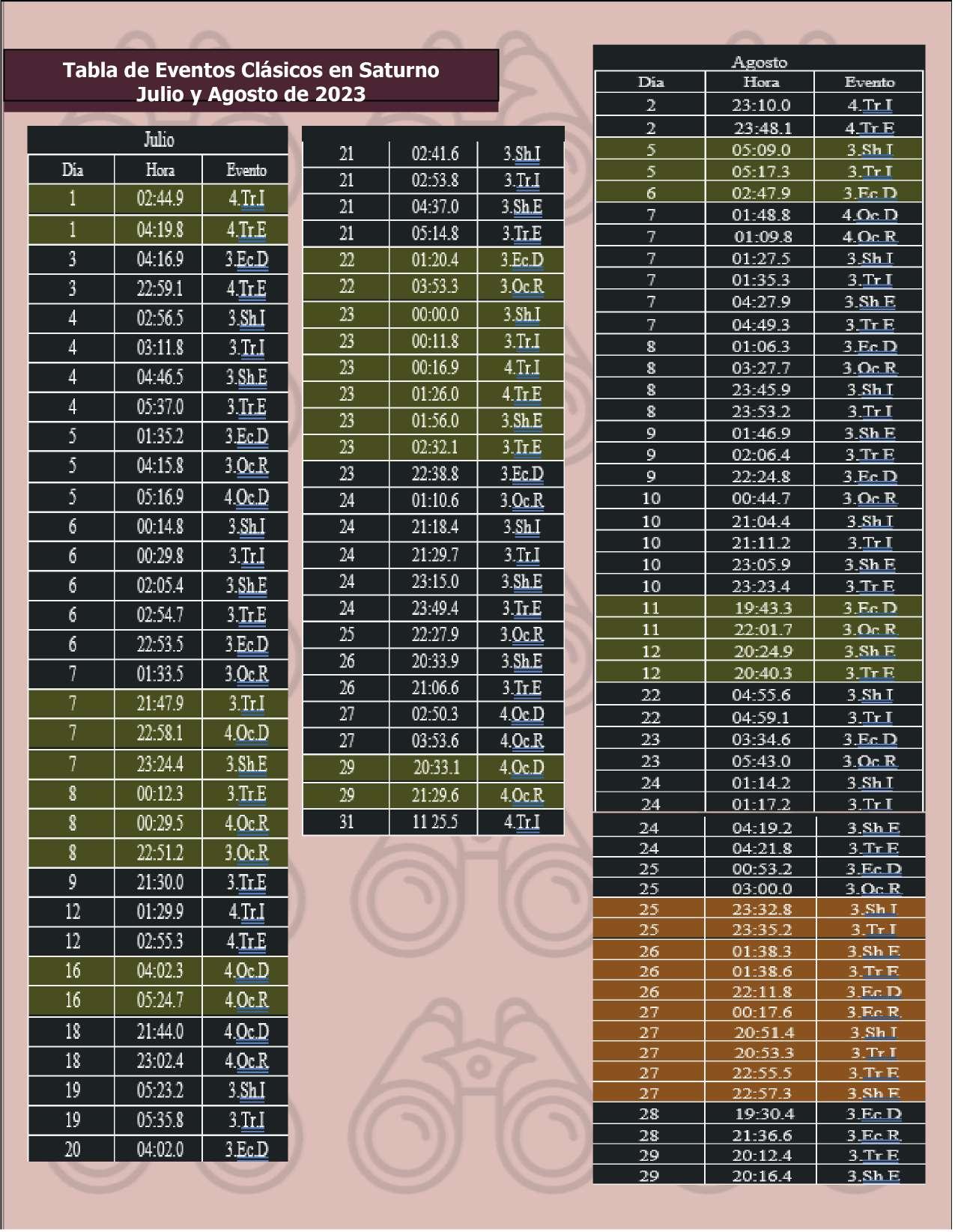 Uno de los mayores espectáculos que ofrecen Júpiter y Saturno es el tránsito de sus lunas frente a ellos. Este tipo de eventos se llaman Fenómenos Clásicos. Podemos verlas cruzando el disco de su planeta (tránsito de luna: Tr) o proyectando sus sombras en él (tránsito de sombra Sh). Al inicio del tránsito se le llama Ingreso (I) y al final del tránsito se le llama Egreso (E). Podemos verlas ocultarse detrás del planeta (Oc) o ser eclipsadas por la sombra del planeta (Ec). Se llama Desaparición al momento en que la luna es eclipsada u ocultada por el planeta y Reaparición (R) al momento en que termina el evento. En este video se puede ver un ejemplo de fenómenos clásicos en Júpiter (https://www.youtube.com/watch?v=3j0oI95krkA).