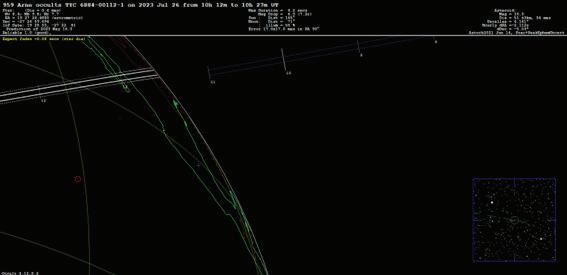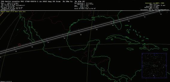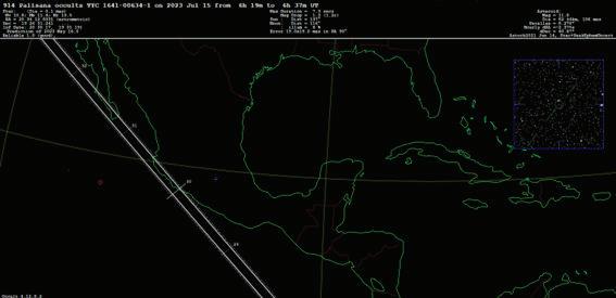 En esta propuesta de observación, las ocultaciones estelares debidas a asteroides (diámetro > 25 km) están limitadas a estrellas con magnitud más brillante que 11. Las figuras tienen un encabezado donde se indica el número de asteroide, la estrella y la fecha del evento (Tiempo Universal). Abajo del encabezado se proporcionan detalles: de la estrella su magnitud y coordenadas (extrema izquierda), de la ocultación su máxima duración y la disminución de magnitud de la estrella (en el centro) e información del asteroide como su magnitud y diámetro (extrema derecha). En la parte inferior de la figura se puede ver el mapa de Mexico y la trayectoria desde donde se verá la ocultación. La posición de Toluca se marca con una cruz azul en los mapas. A lo largo de la trayectoria se muestran unos números que indican el minuto en que se verá en cada marca.