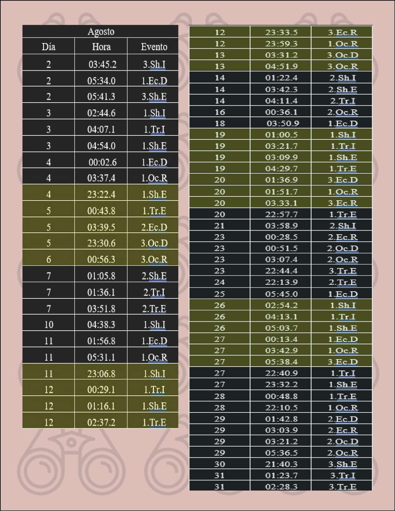 Las ocultaciones estelares debidas a planetas y sus lunas están limitadas a estrellas con magnitud más brillante que 11 con el objeto de hacerlo accesible a telescopios no muy grandes. No tendremos este tipo de eventos en el bimestre.