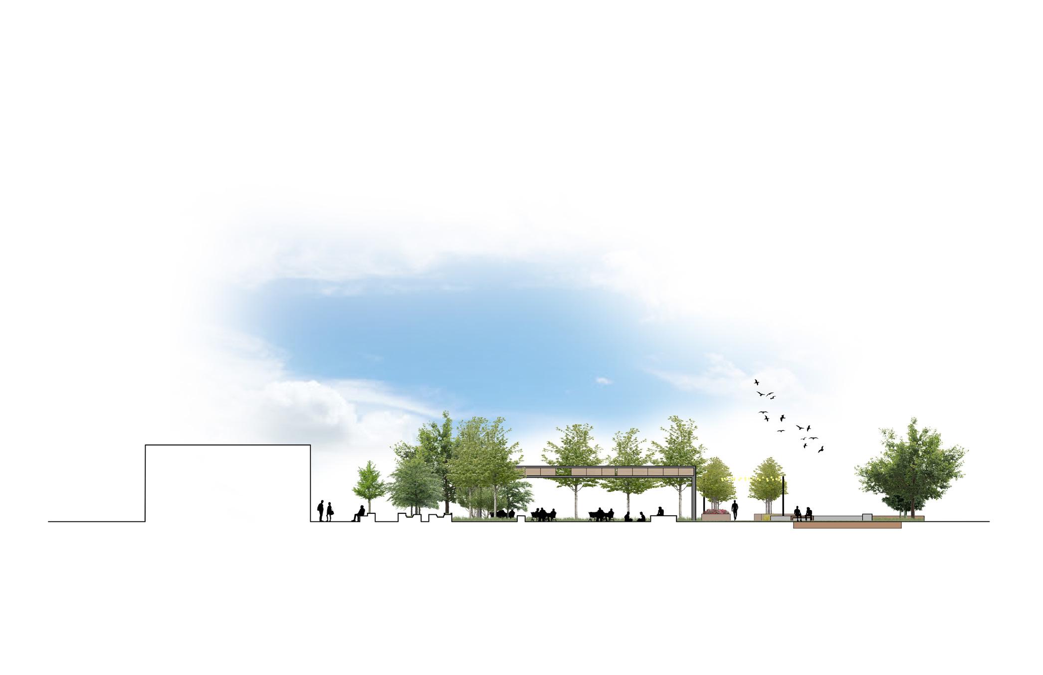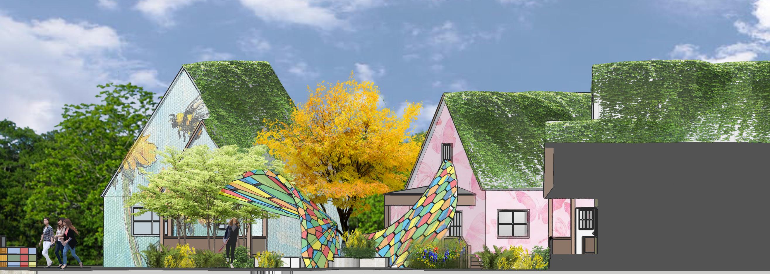 Section that features the overhead structure, murals, and green roofs located on the right side of the site.
