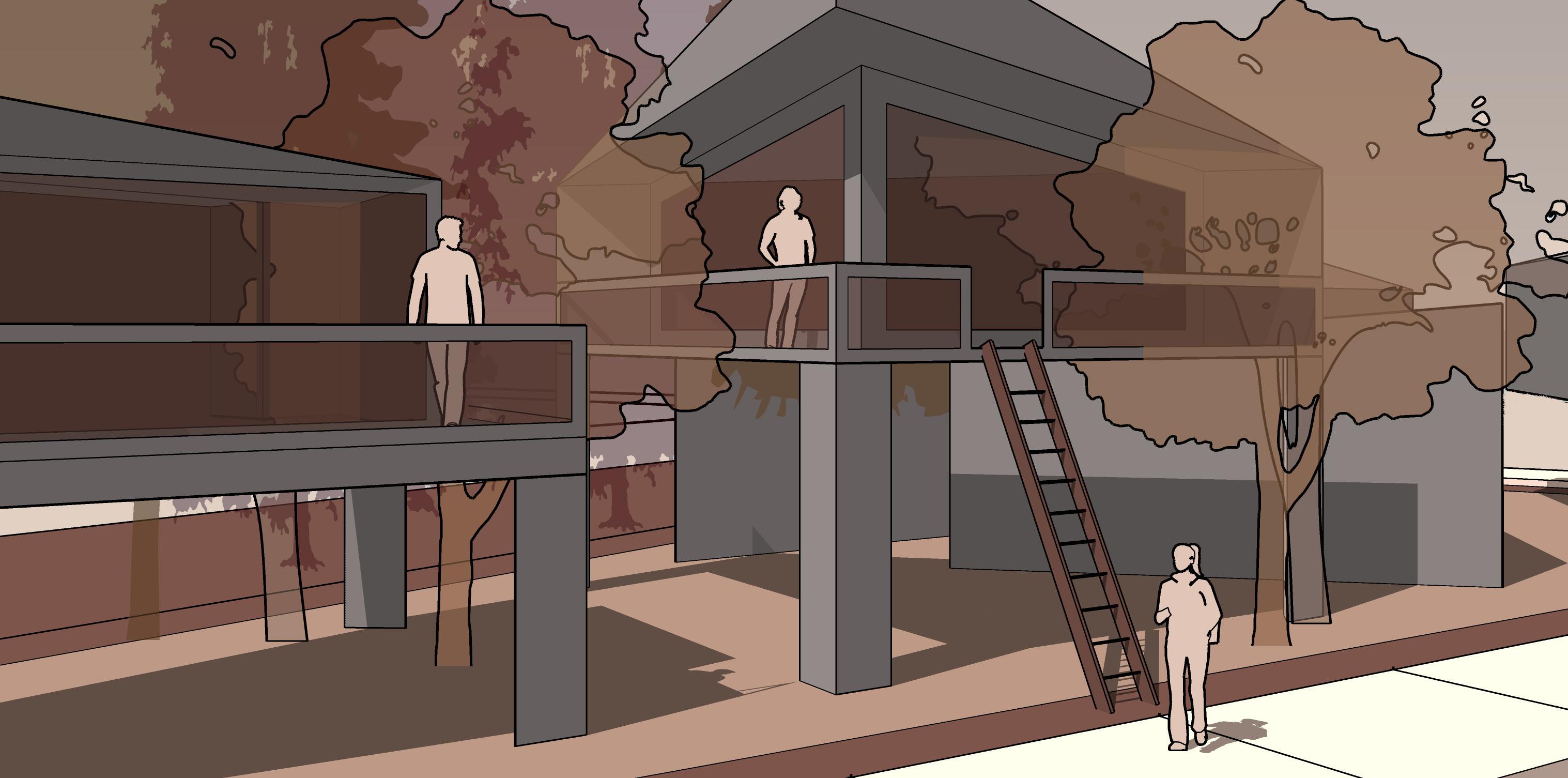 Perspective that depicts the vegetated overhead structure, bridge, and elevation changes. The site is extremely vegetated and evokes a since of calm.