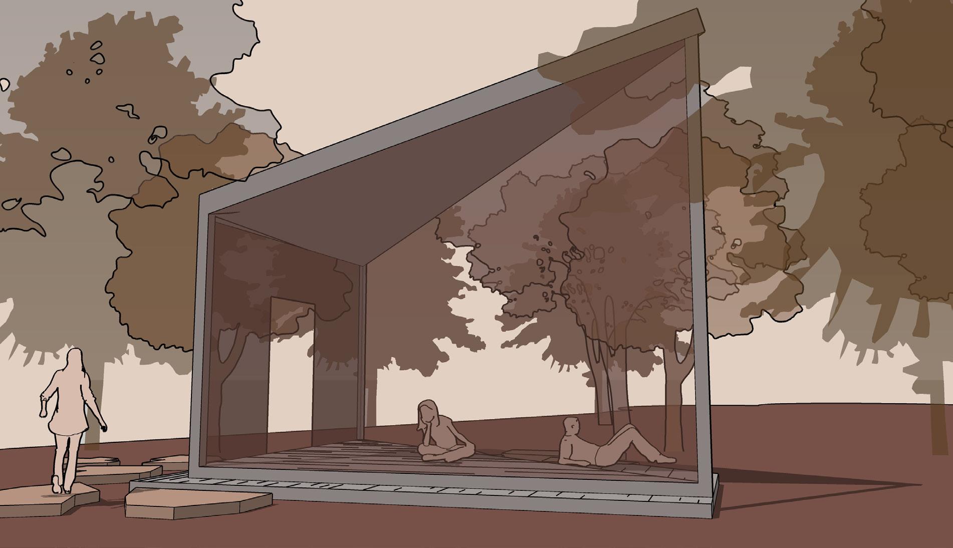 Located on the far right side of the site and glassed in on only two sides, its purpose is to allow a space of quiet enjoyment for nature.