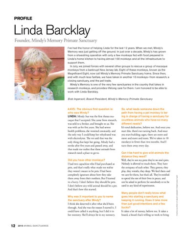 Founder, Mindy’s Memory Primate Sanctuary I’ve had the honor of helping Linda for the last 12 years. When we met, Mindy’s Memory was just getting off the ground. In just over a decade, Mindy’s has grown from a shoestring operation with only a few monkeys fed with food prepared in Linda’s home kitchen to having almost 100 monkeys and all the infrastructure to support them. In July, we joined forces with several other groups to rescue a group of macaque monkeys from a bankrupt New Jersey lab. Eight of these monkeys, known as the Magnificent Eight, now call Mindy’s Memory Primate Sanctuary home. Since then, and with much less fanfare, we have taken in another 10 monkeys—from research, a closing sanctuary, and the pet trade. Mindy’s Memory is one of the very few sanctuaries in the country that takes in research monkeys, and provides lifelong care for them. I am honored to be able to work with Linda Barcklay.