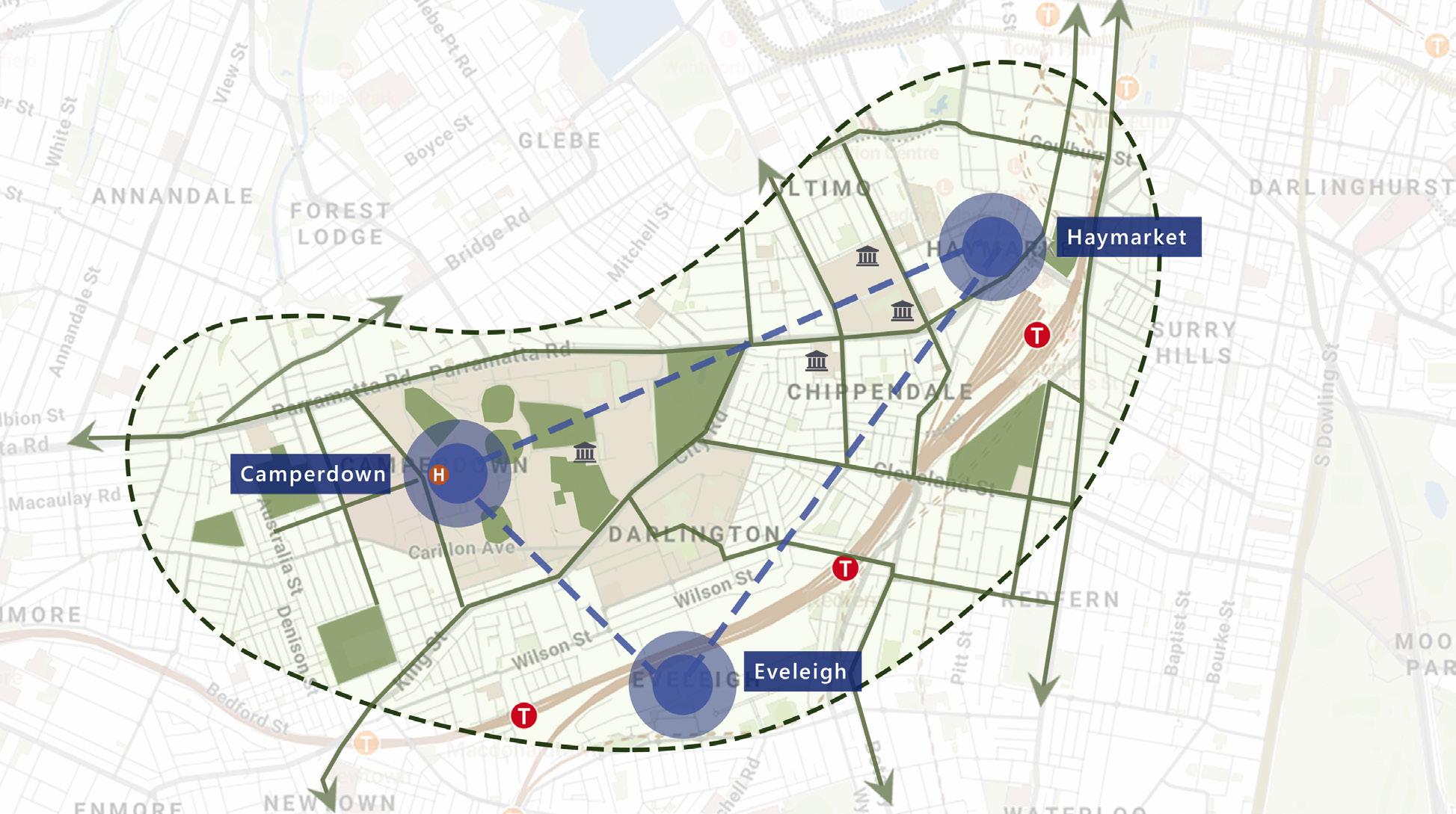 The precinct consists of three activity nodes – Haymarket, Camperdown, and Eveleigh, with three connecting axes – the Ultimo axis, Darlington axis and Surry Hills axis. It consists of different industry sectors like hospitals, universities, research institutes as well as start-ups that strengthen the area’s economy. Major assets include the heavy and light rail systems. The area also includes green spaces Victoria Park, Prince Alfred Park , Belmore Park, Camperdown Park, Camperdown Memorial Rest Park, Mary Ann Street Park, McKee Street Reserve, Peace Park, Hollis Park and Green Bans Park. These green spaces create an opportunity to integrate with Sydney’s green grid and increase tree cover as the connectors (Greater Sydney Commission 2019).