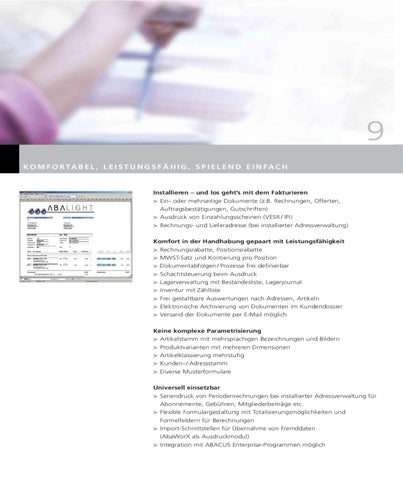 Installieren – und los geht’s mit dem Fakturieren > Ein- oder mehrseitige Dokumente (z.B. Rechnungen, Offerten, Auftragsbestätigungen, Gutschriften) > Ausdruck von Einzahlungsscheinen (VESR / IPI) > Rechnungs- und Lieferadresse (bei installierter Adressverwaltung) Komfort in der Handhabung gepaart mit Leistungsfähigkeit > Rechnungsrabatte, Positionsrabatte > MWST-Satz und Kontierung pro Position > Dokumentabfolgen / Prozesse frei definierbar > Schachtsteuerung beim Ausdruck > Lagerverwaltung mit Bestandesliste, Lagerjournal > Inventur mit Zählliste > Frei gestaltbare Auswertungen nach Adressen, Artikeln > Elektronische Archivierung von Dokumenten im Kundendossier > Versand der Dokumente per E-Mail möglich Keine komplexe Parametrisierung > Artikelstamm mit mehrsprachigen Bezeichnungen und Bildern > Produktvarianten mit mehreren Dimensionen > Artikelklassierung mehrstufig > Kunden- / Adressstamm > Diverse Musterformulare Universell einsetzbar > Seriendruck von Periodenrechnungen bei installierter Adressverwaltung für Abonnemente, Gebühren, Mitgliederbeiträge etc. > Flexible Formulargestaltung mit Totalisierungsmöglichkeiten und Formelfeldern für Berechnungen > Import-Schnittstellen für Übernahme von Fremddaten (AbaWorX als Ausdruckmodul) > Integration mit ABACUS Enterprise-Programmen möglich