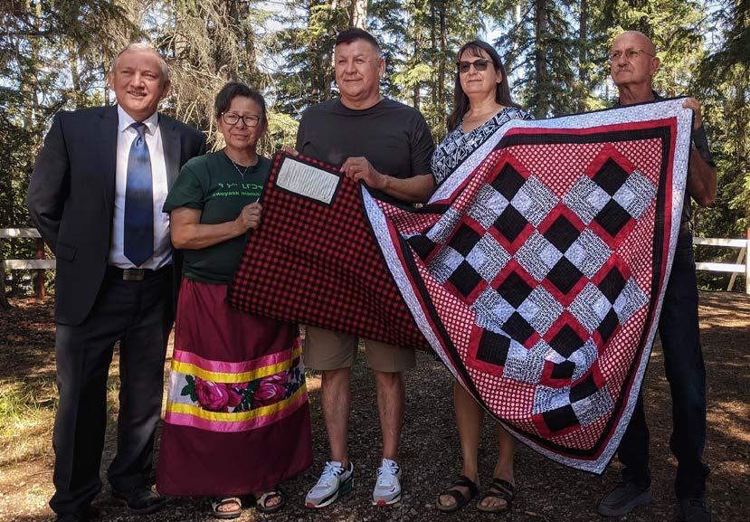 Featured speaker Chief Randy Ermineskin (centre, wife Fran, left, President Gary Hodder far left) was pleased to receive a quilt pieced by Jim Baker and quilted by Kelly Dregger (far right and right). Kelly has taught at MANS since the school opened. Hear Ermineskin’s presentation at albertaadventist.ca/ thebridge and the full July 16 launch program in the Camp Meeting 2022 archive section of the website.