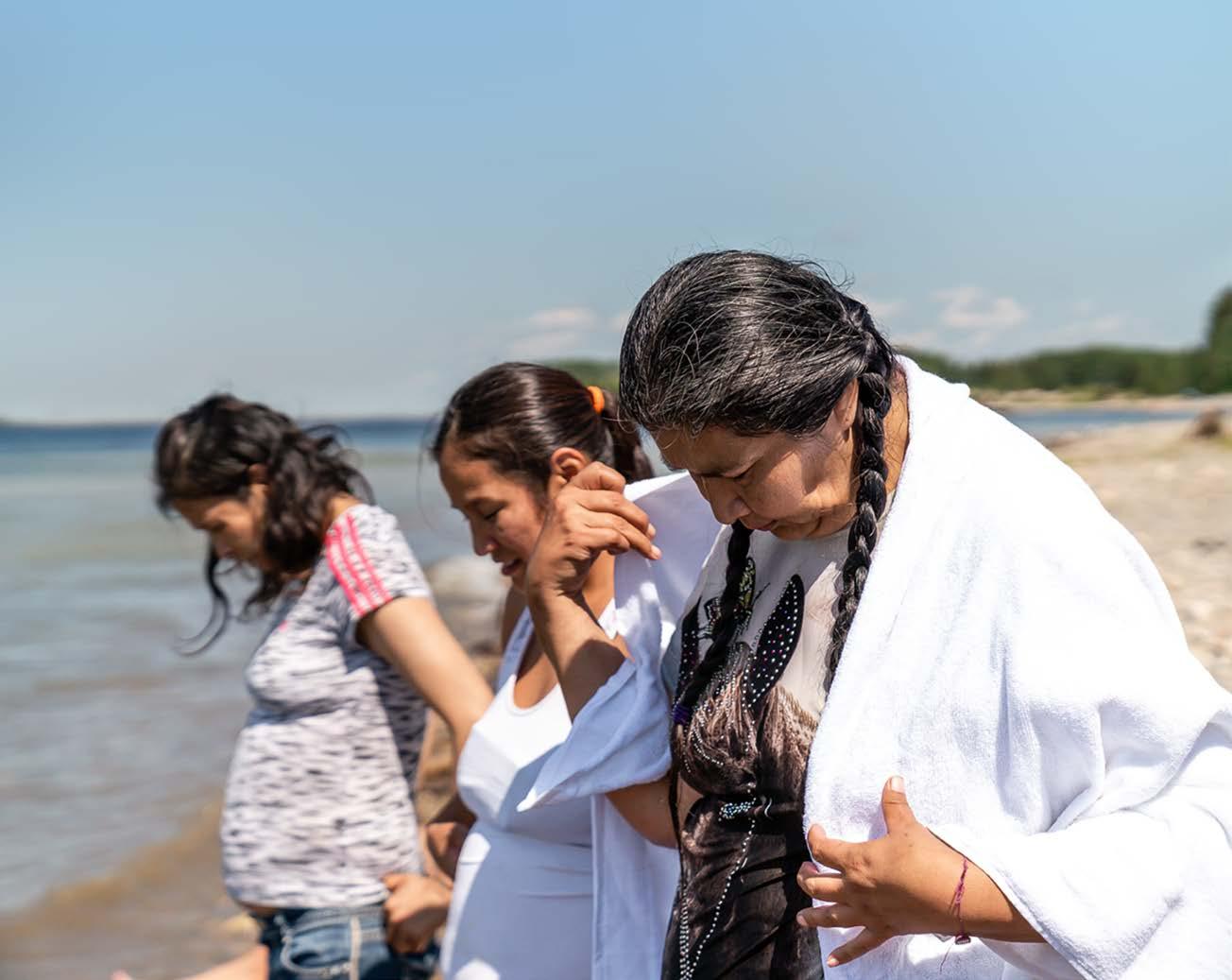 Matriarch Belinda Soosay (right), still dripping after her baptism, bows her head with Carmelia Soosay and Belinda’s sister, Emily Soosay, on the beach of Dickson Dam.