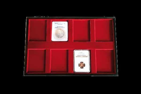 Wood black covered and classic red velvet tray special for 8 coins in slab.