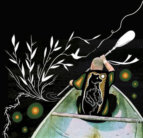 The moon glows neon emerging from red raspberries and shines down upon Anishinaabe aki and reflects off the water. The wild rice has grown long and strong enough to reach beyond the surface where the water meets the air.