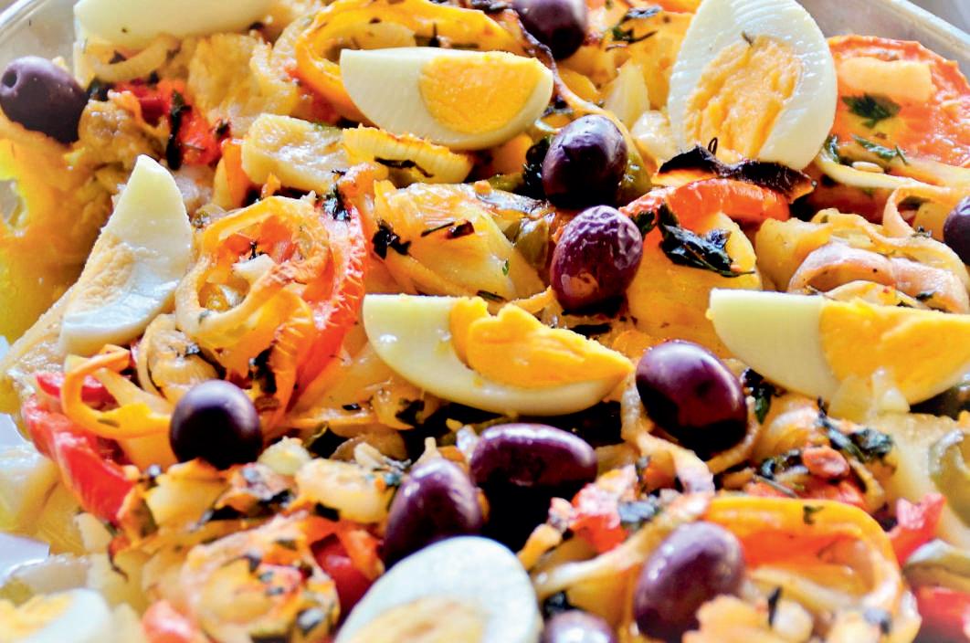 9- Arrange the codfish in slices on top of the potatoes, garnish with slices of egg, tomatoes, onionsandpeppersontopandaroundit;