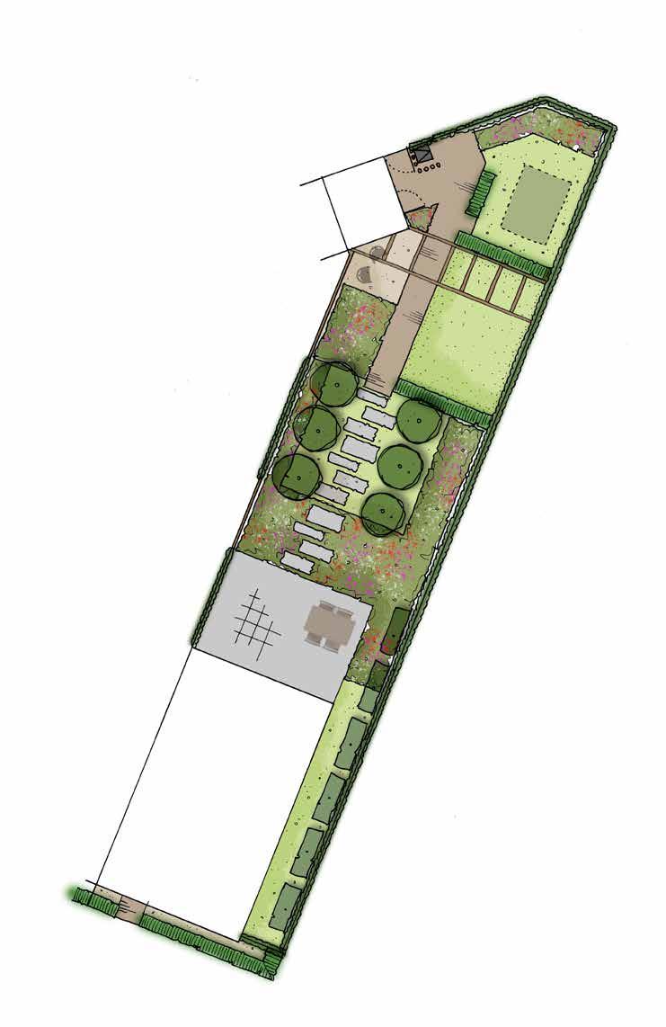 Bovenstaande ontwerpen zijn voorbeelden. Bekijk de situatietekening voor de tuin van uw favoriete bouwnummer. De tuinen verschillen van elkaar.