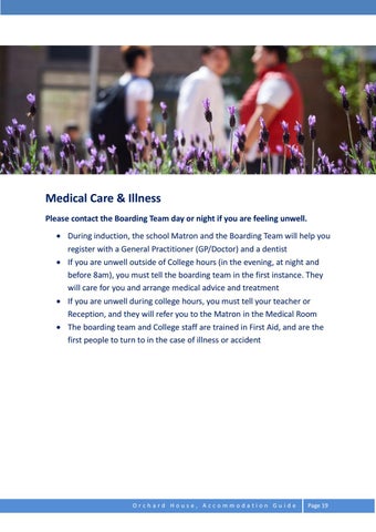 Medical Care & Illness Please contact the Boarding Team day or night if you are feeling unwell. • During induction, the school Matron and the Boarding Team will help you register with a General Practitioner (GP/Doctor) and a dentist • If you are unwell outside of College hours (in the evening, at night and before 8am), you must tell the boarding team in the first instance. They will care for you and arrange medical advice and treatment • If you are unwell during college hours, you must tell your teacher or Reception, and they will refer you to the Matron in the Medical Room • The boarding team and College staff are trained in First Aid, and are the first people to turn to in the case of illness or accident