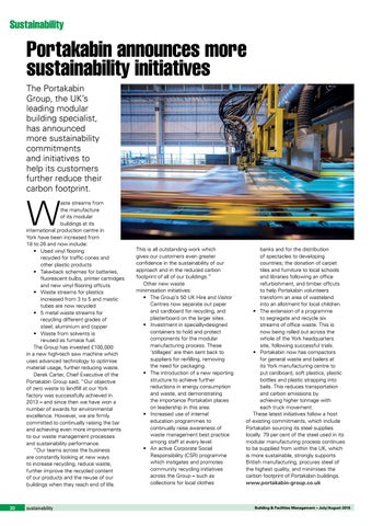 This is all outstanding work which gives our customers even greater confidence in the sustainability of our approach and in the reduced carbon footprint of all of our buildings.” Other new waste minimisation initiatives: • The Group’s 50 UK Hire and Visitor Centres now separate out paper and cardboard for recycling, and plasterboard on the larger sites. • Investment in specially-designed containers to hold and protect components for the modular manufacturing process. These ‘stillages’ are then sent back to suppliers for re-filling, removing the need for packaging. • The introduction of a new reporting structure to achieve further reductions in energy consumption and waste, and demonstrating the importance Portakabin places on leadership in this area. • Increased use of internal education programmes to continually raise awareness of waste management best practice among staff at every level. • An active Corporate Social Responsibility (CSR) programme which instigates and promotes community recycling initiatives across the Group – such as collections for local clothes