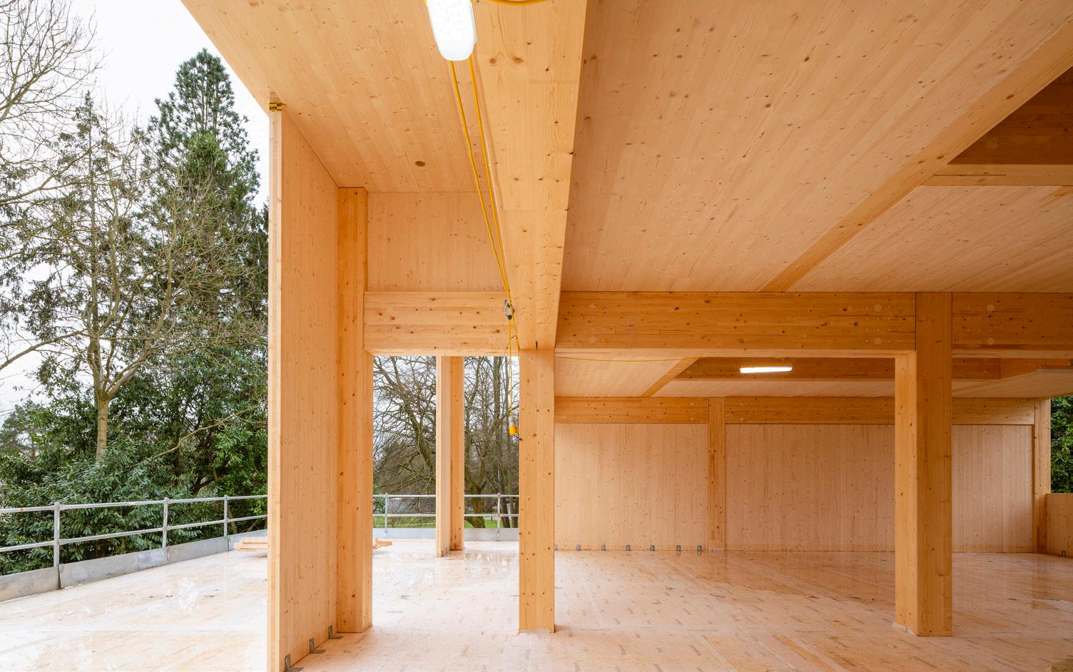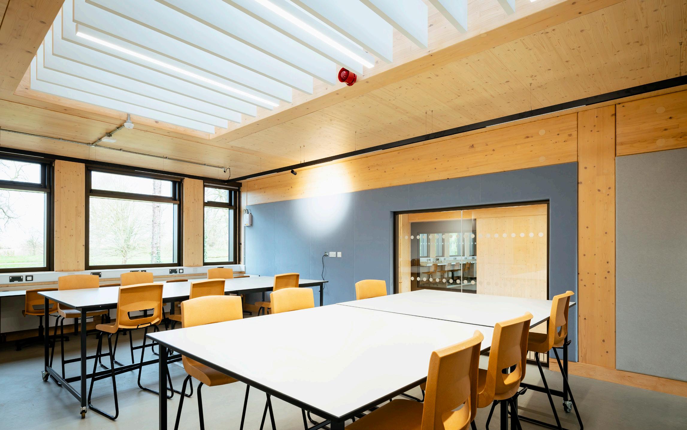 tonnes of ground-floor steel grillage. The expert project team included architects Design Engine, structural engineers Buro Happold, specialist timber engineers Engenuiti, and CLT manufacturer Stora Enso. The collaborative result is a visually expressive, low-carbon, twostorey facility that functions not only as a high-quality learning space but also as a living laboratory; with visual elements allowing students to explore and engage with the building’s engineering principles first-hand.