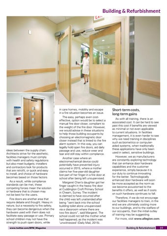 ideas between the supply chain. Architects strive for the aesthetic; facilities managers must comply with health and safety regulations but also meet budgets; installers and contractors look for products that are retrofit, or quick and easy to install, and choice of hardware becomes based on those factors. As a result, while compliance standards can be met, these competing forces mean the solution or hardware that is chosen may not be best for the users. Fire doors are another area that require debate and thought. Heavy in nature, but a necessity to fire safety, they can become dangerous when the hardware used with them does not facilitate easy passage or use. Primary school children may not have the strength to push open doors, while www.twitter.com/BFM_Magazine