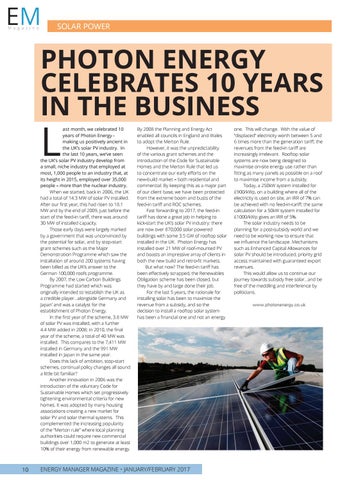 ast month, we celebrated 10 years of Photon Energy making us positively ancient in the UK’s solar PV industry. In the last 10 years, we’ve seen the UK’s solar PV industry develop from a small, niche industry that employed at most, 1,000 people to an industry that, at its height in 2015, employed over 35,000 people – more than the nuclear industry. When we started, back in 2006, the UK had a total of 14.3 MW of solar PV installed. After our first year, this had risen to 18.1 MW and by the end of 2009, just before the start of the feed-in tariff, there was around 30 MW of installed capacity. Those early days were largely marked by a government that was unconvinced by the potential for solar, and by stop-start grant schemes such as the Major Demonstration Programme which saw the installation of around 200 systems having been billed as the UK’s answer to the German 100,000 roofs programme. By 2007, the Low Carbon Buildings Programme had started which was originally intended to ‘establish the UK as a credible player...alongside Germany and Japan’ and was a catalyst for the establishment of Photon Energy. In the first year of the scheme, 3.8 MW of solar PV was installed, with a further 4.4 MW added in 2008; in 2010, the final year of the scheme, a total of 40 MW was installed. This compares to the 7,411 MW installed in Germany and the 991 MW installed in Japan in the same year. Does this lack of ambition, stop-start schemes, continual policy changes all sound a little bit familiar? Another innovation in 2006 was the introduction of the voluntary Code for Sustainable Homes which set progressively tightening environmental criteria for new homes. It was adopted by many housing associations creating a new market for solar PV and solar thermal systems. This complemented the increasing popularity of the “Merton rule” where local planning authorities could require new commercial buildings over 1,000 m2 to generate at least 10% of their energy from renewable energy.