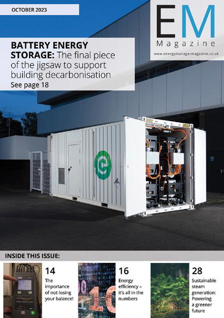 INSIDE ENERGY MANAGER MAGAZINE • OCTOBER 2023 3 4 News 12 Exhibition News 14 Monitoring & Metering 16 Energy Management 18 Energy Storage 20 Energy Supply 22 Energy Finance 25 Energy Procurement 26 District Heating 28 Steam Systems 29 Water Management 30 Lighting 32 Heating 34 Training 35 Legislation Battery energy storage: The final piece of the jigsaw to support building decarbonisation FRONT COVER STORY: See page 18