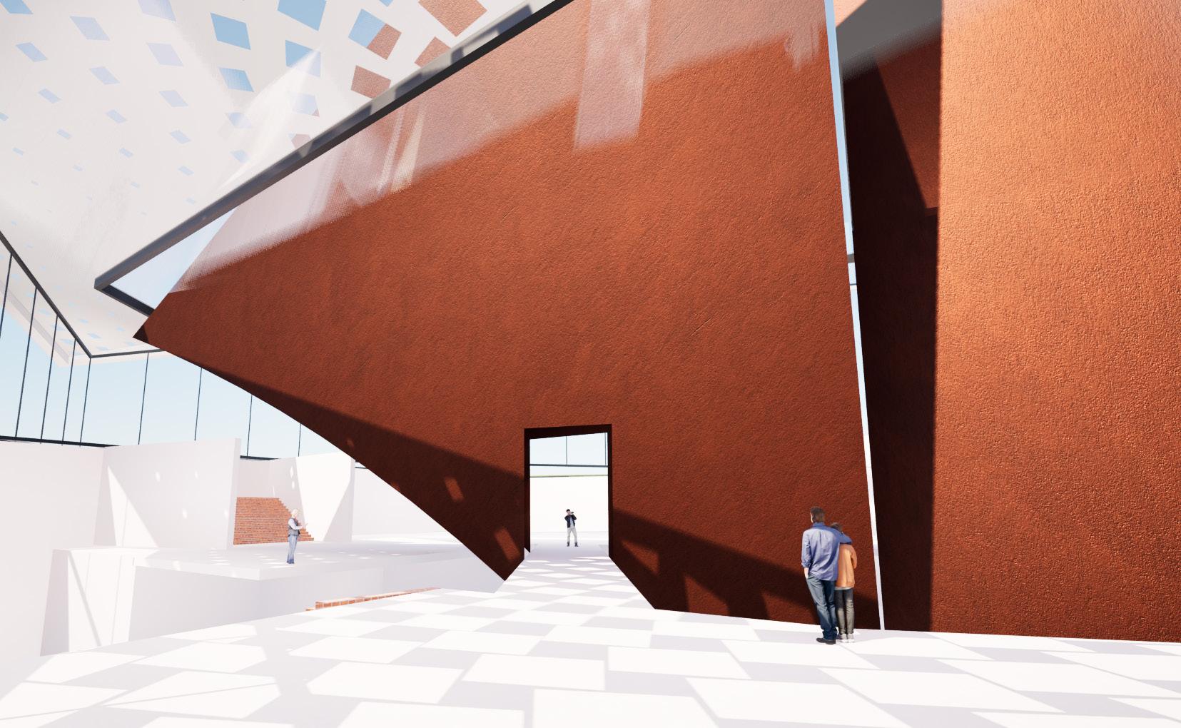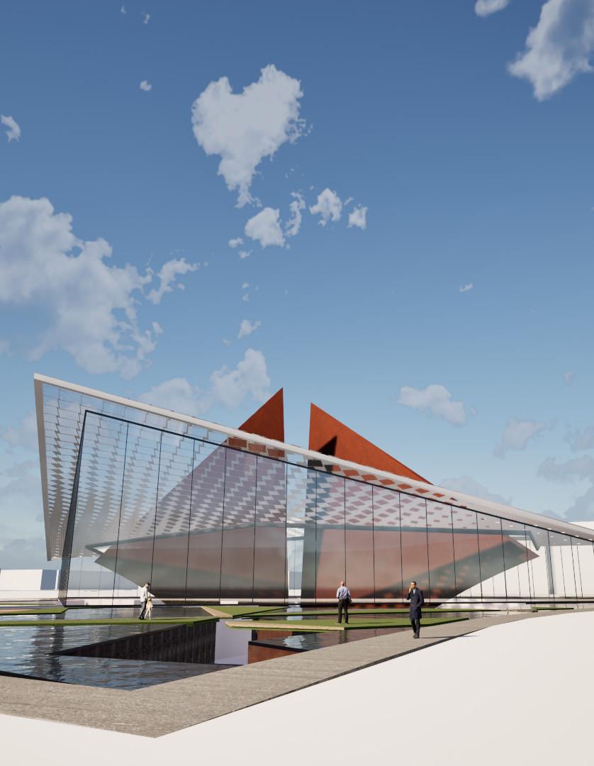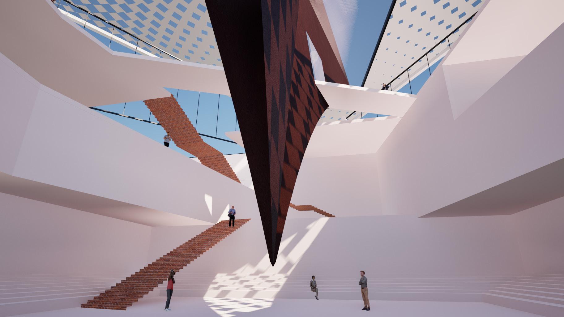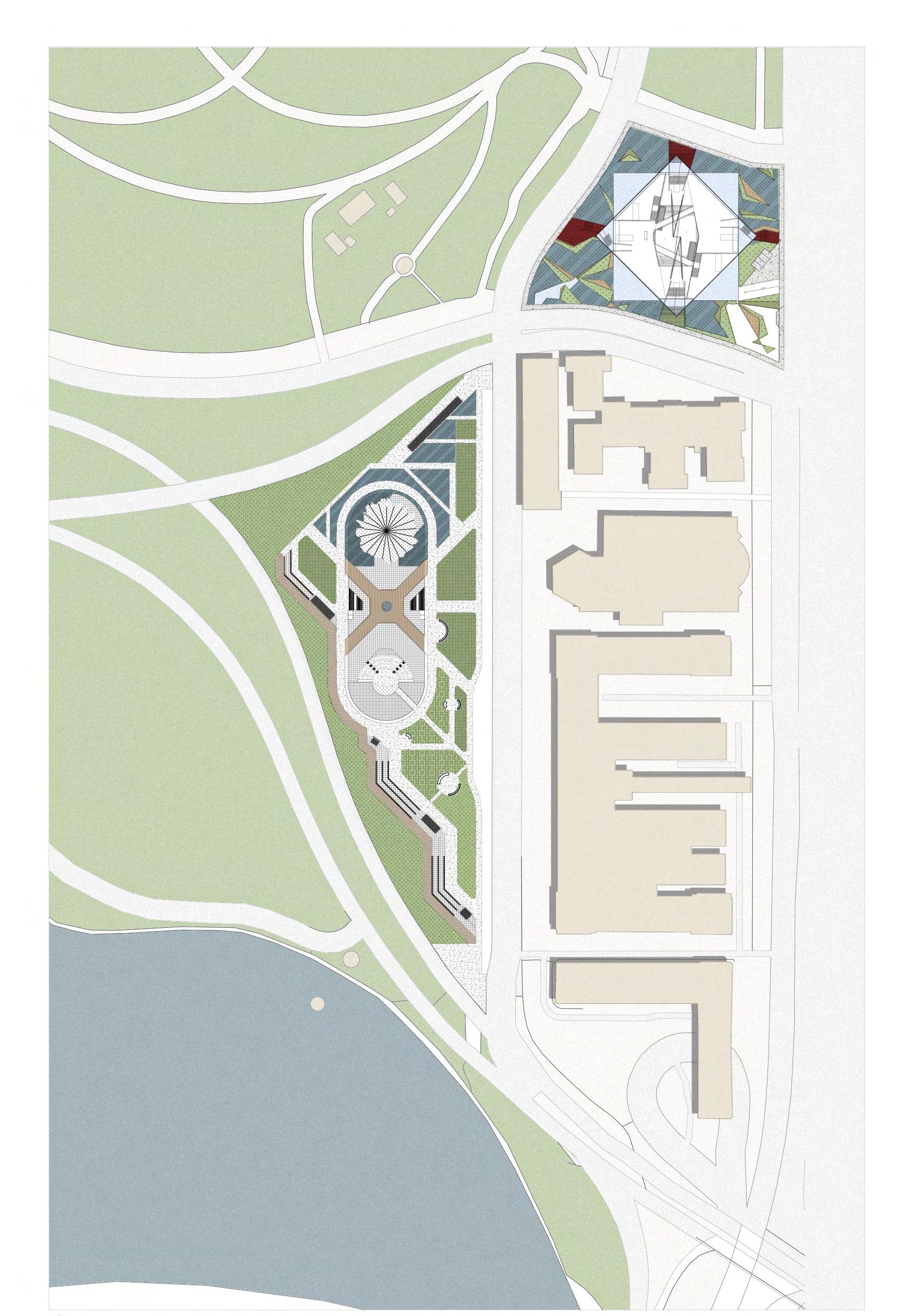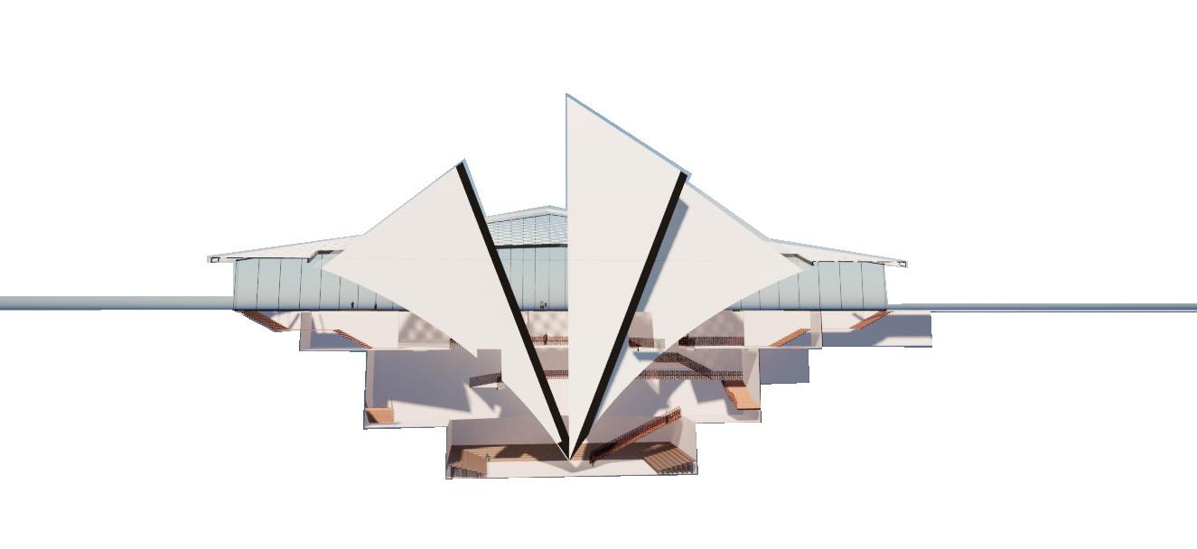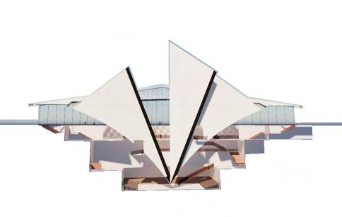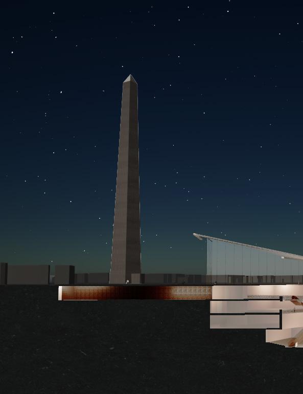 Located in the South Quadrant of the National Mall, our project, “Journey to El Centro,” is a vibrant tribute to the rich tapestry of Latino culture and heritage in the United States. It serves as a bridge between the past and the present, inviting visitors to reconnect with their core identity and delve into the deeply rooted values of the land while shedding light on the strenuous yet resilient journeys of Latino families to the United States. Through our site, we aim to explore the interconnected themes of land, orientation, and journey. Aligning with the Washington DC Capitol axis and across the African American Museum, The museum is centered around two points of alignment coordinators that split on top and unite at the bottom of the building, connecting sky and ground or community and self; symbolizing a sign of coordinal direction and a way to find your centro. The water and landforms surrounding the entire museum ground, represent a reflection of immigration through lands and waters, providing a safe haven for those who lost their lives to find a better home. Connecting both architecture and landscape projects is an underground tunnel that highlights the struggles of immigration through a dark atmosphere showing the hope of the light at the end of the tunnel.