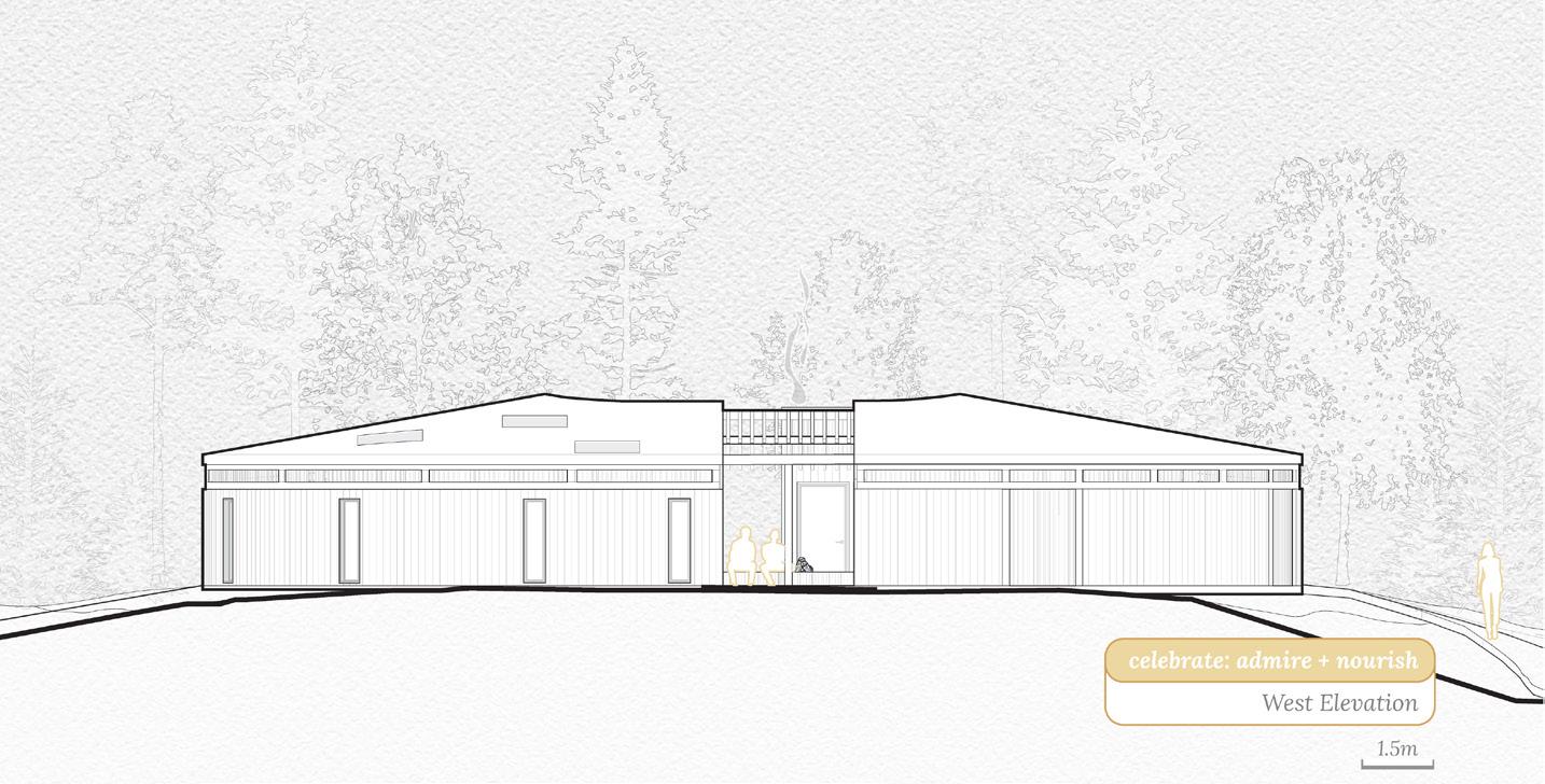 The celebration space allows visitors to relish in and appreciate their experiences with nature. Inside, curved partition walls of eelgrass block invite admiration and provoke thought: what other potentials do natural materials hold? A central firepit encourages a final moment to celebrate communally.