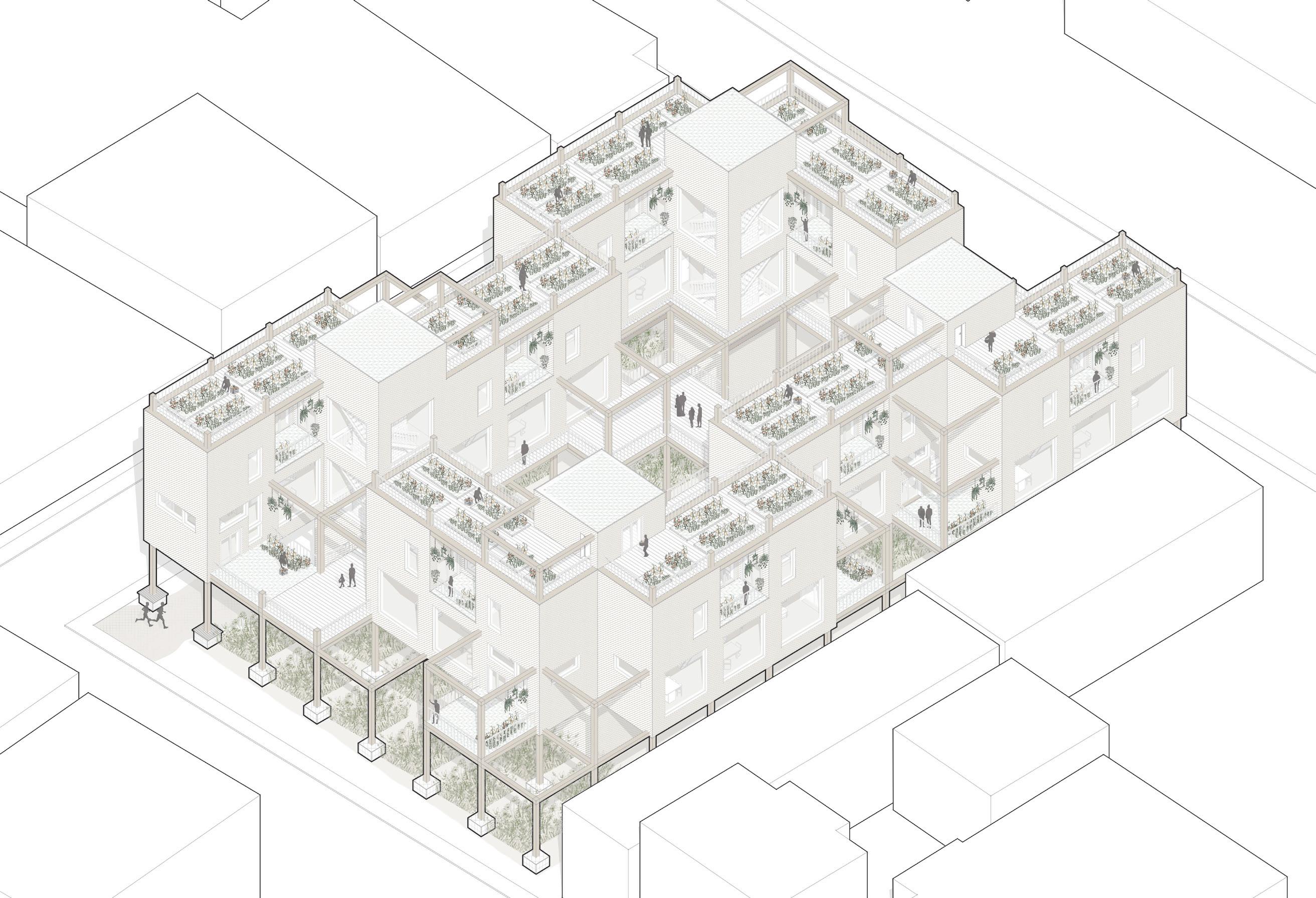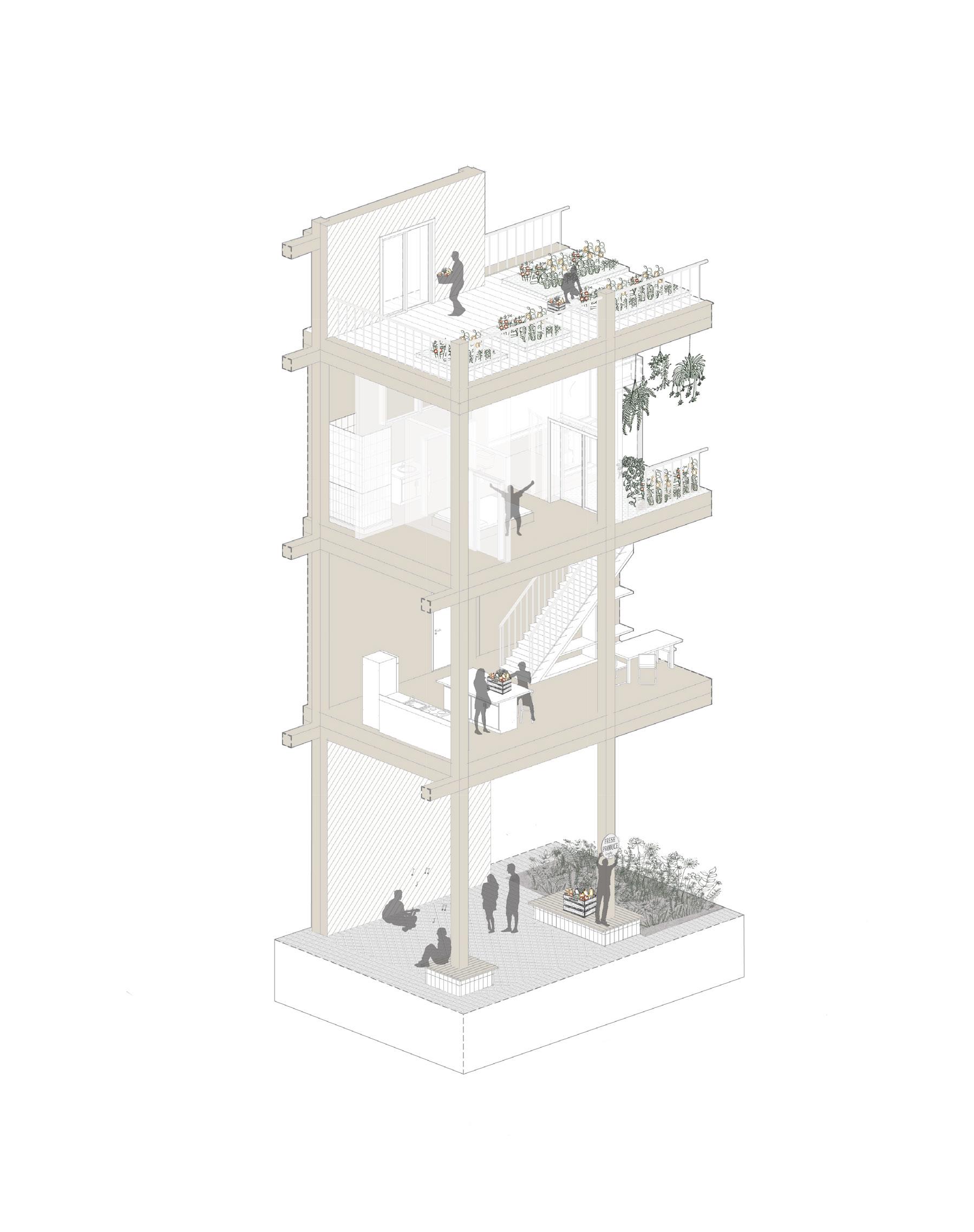 Through natural remediation, sites are transformed into public green space. The revived site then supports adjacent community, and encourages urban agricultural co-operatives. Clusters of co-living units provide access to rooftop gardens, ensuring food security for tenants and community members alike.