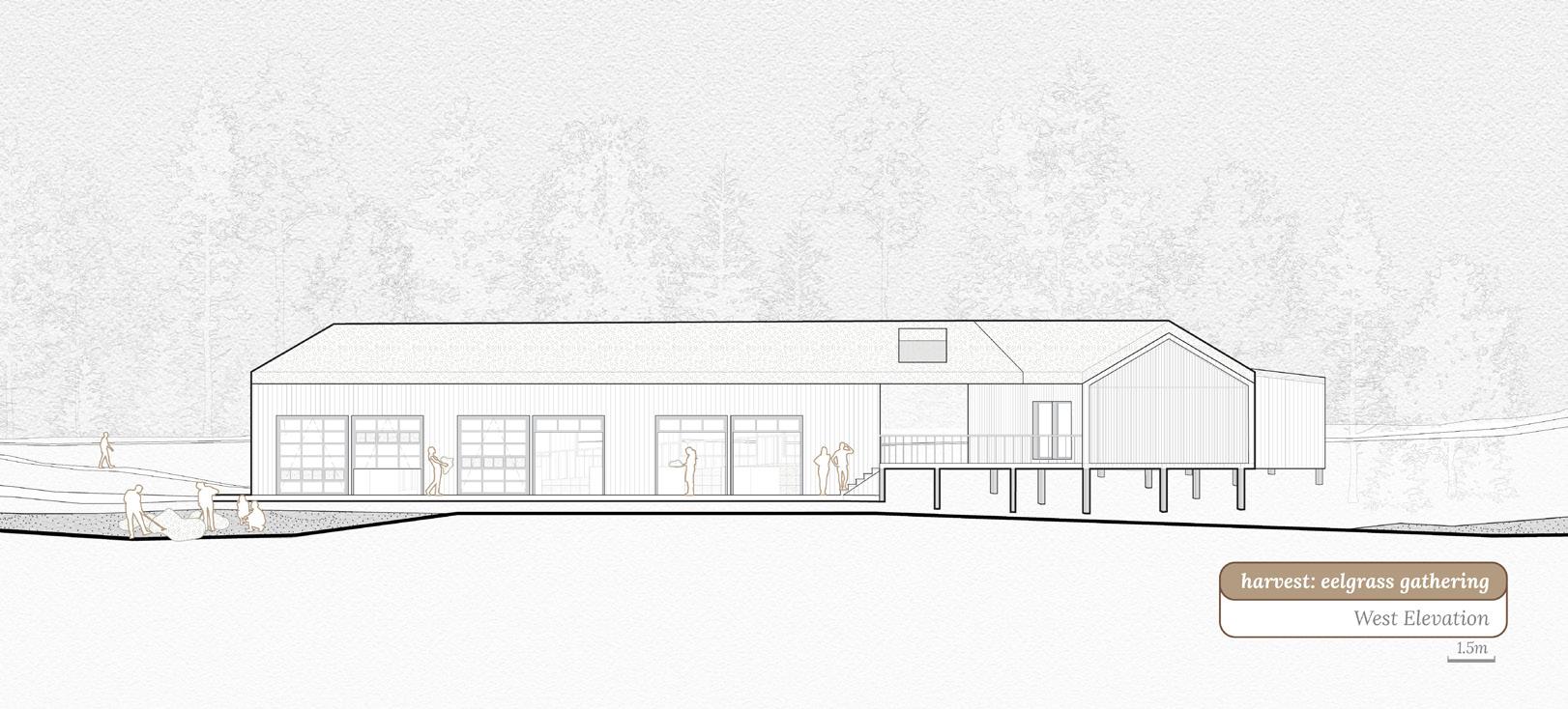 The harvest site begins and ends the Eelgrass Spa experience. Building form invites visitors into the warehouse, where local harvesters share coastal knowledge and spa visitors can observe or physically participate in the harvesting process.
